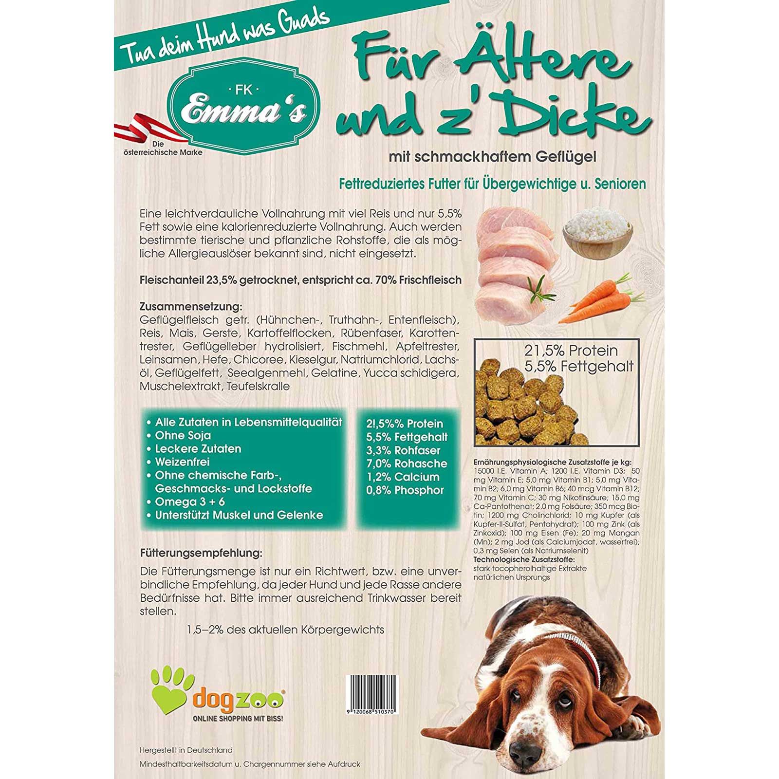 Emma's Hundfoder Äldre & Runda Hundar är ett lättsmält helfoder med mycket ris och endast 5,5 % fett. Torrfodret är lämpligt på grund av dess reducerade kalorier- & fettinnehåll mycket väl för Seniorer eller som dietmat vid övervikt. Den hälsosamma kompletta maten med fjäderfäkött av hög kvalitet erbjuder en utmärkt smältbarhet med en hög acceptans. Dessutom smakar hundmaten helt enkelt utsökt.