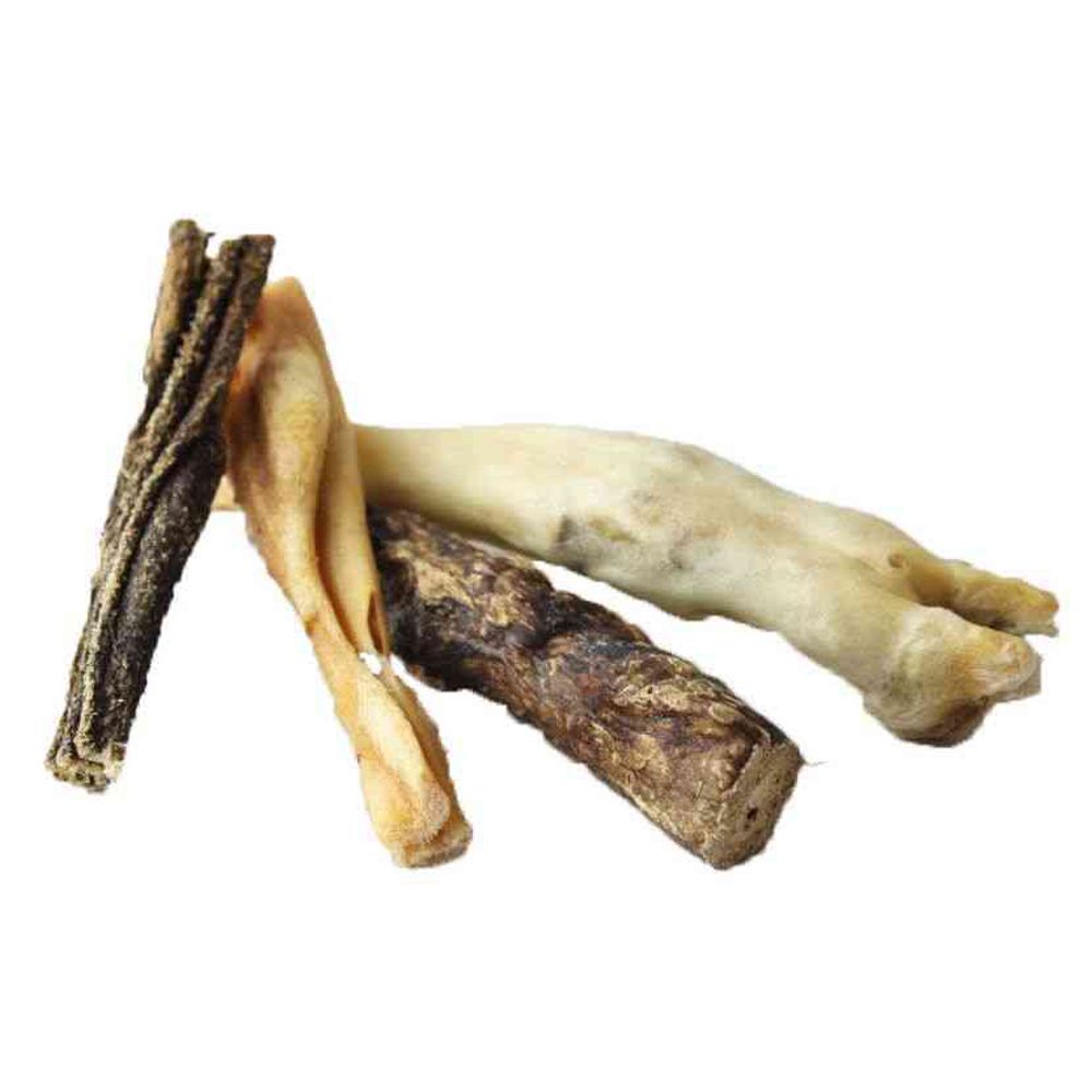 Den här färgglada blandningen innehåller bara det bästa av lammköttet. Noggrant utvalda komponenter som t.ex Lammfot, Lammhuvudskinn, Lammets vommen och Lammets lunga ger en varierad och långvarig och långvarig tuggglädje. Lammets delar är försiktigt lufttorkade och innehåller inga konserveringsmedel, färgämnen eller aromer. På grund av dess goda smältbarhet och tolerans kan det välsmakande lammsnacket även ges till hundar med känsliga mag-tarmkanaler och intoleranser Hundar med känslig mag- och tarmkanal och intolerans mot andra intolerans mot andra köttsorter (nötkött, griskött). Förutom gnagglädjen rengör lammblandningen naturligt tänderna, stärker tuggmusklerna och tandsten gnuggas effektivt bort genom att tugga. Din hund kommer att älska detta speciella tuggmaterial!