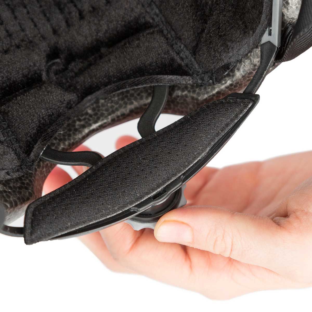 - Extremt elastisk huvudring med skivsystem för individuell och steglös anpassning till huvudstorleken.