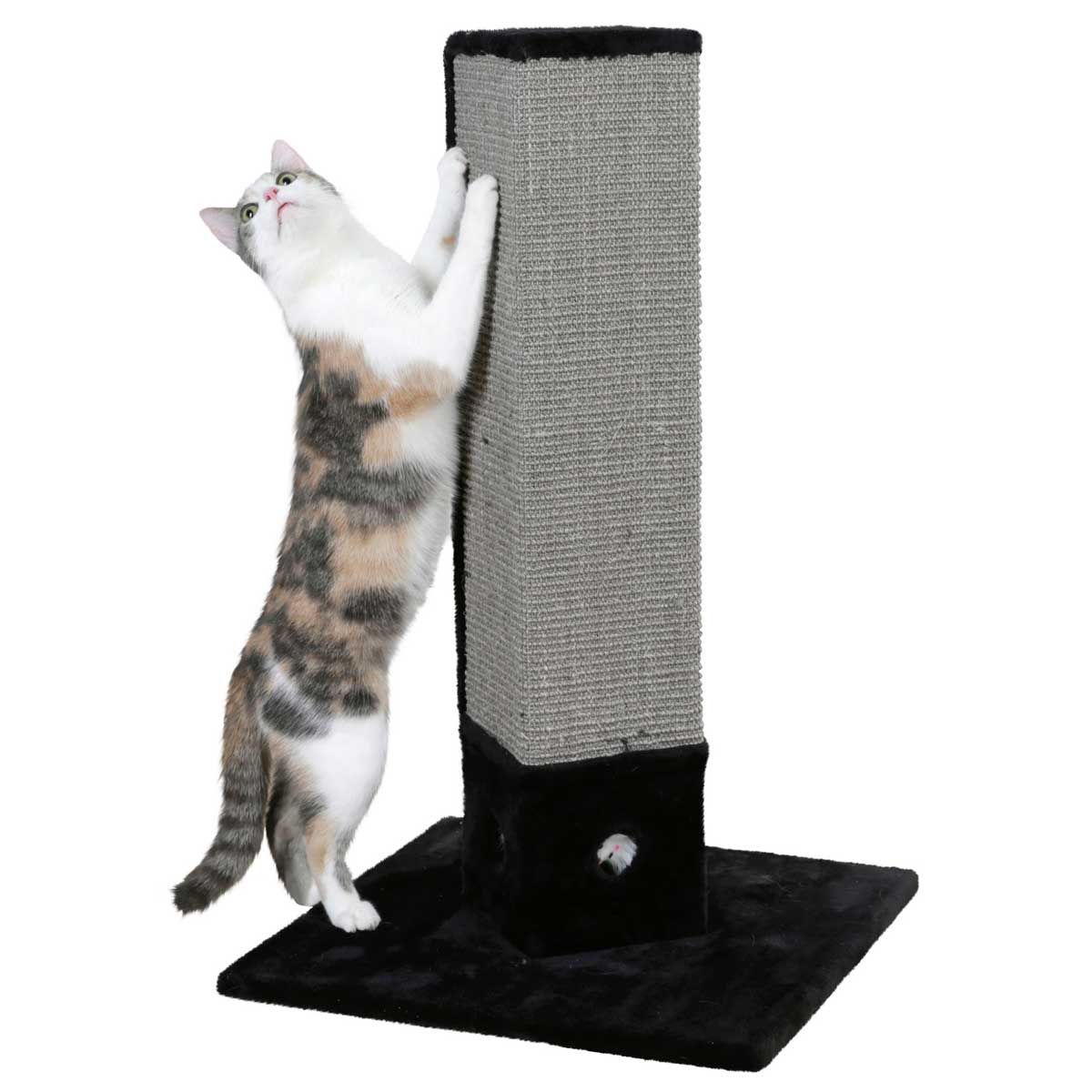 Denna fyrkantiga skrapstolpen är limmad med en sisalmatta på tre sidor och täckt med plysch på de återstående ytorna.
