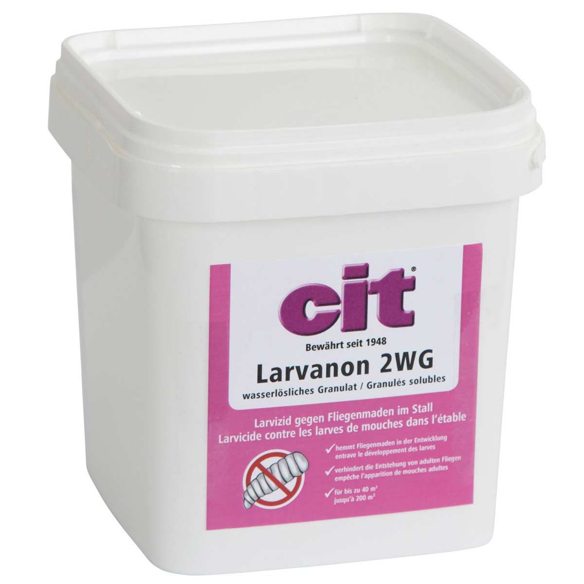 Det vattenlösliga insekts- och flugbekämpningsgranulatet "Cit Larvanon 2 WG "* används för att bekämpa fluglarver i djurstallar. Produkten innehåller en tillväxthämmare som är särskilt effektiv mot alla fluglarver. Appliceringsmängd för alla metoder: 250 g per 10 m² flyghäckningsområde Spridningsmetod: Sprids torrt i breda kuber.