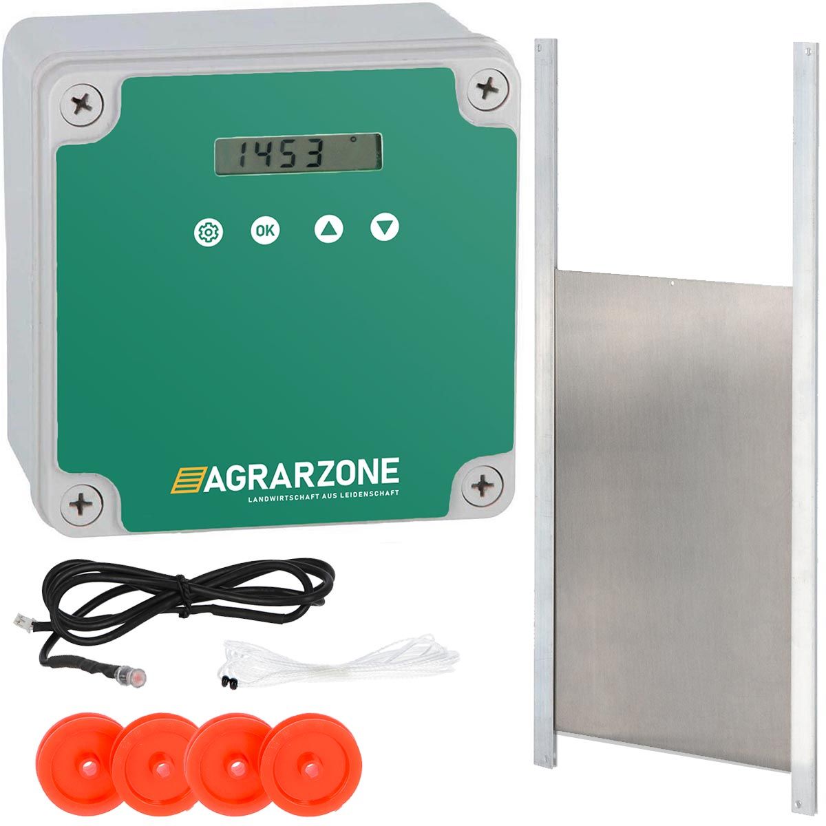 Det elektroniska reglaget öppnar och stänger dörren för fjäderfä efter behov. Fjäderfödedörren öppnar den vertikala glidaren till ditt fjäderfä- eller kycklinghus när det blir ljust och stänger dörren igen när det blir mörkt. Dessutom är det möjligt att använda enheten manuellt. Detta kan göras direkt på enheten eller med den manuella tryckknappen. Känsligheten hos den integrerade skymningsbrytaren kan justeras individuellt så att oavsiktlig öppning förhindras vid åskväder, närbelägna lampor eller strålkastare i hallen.