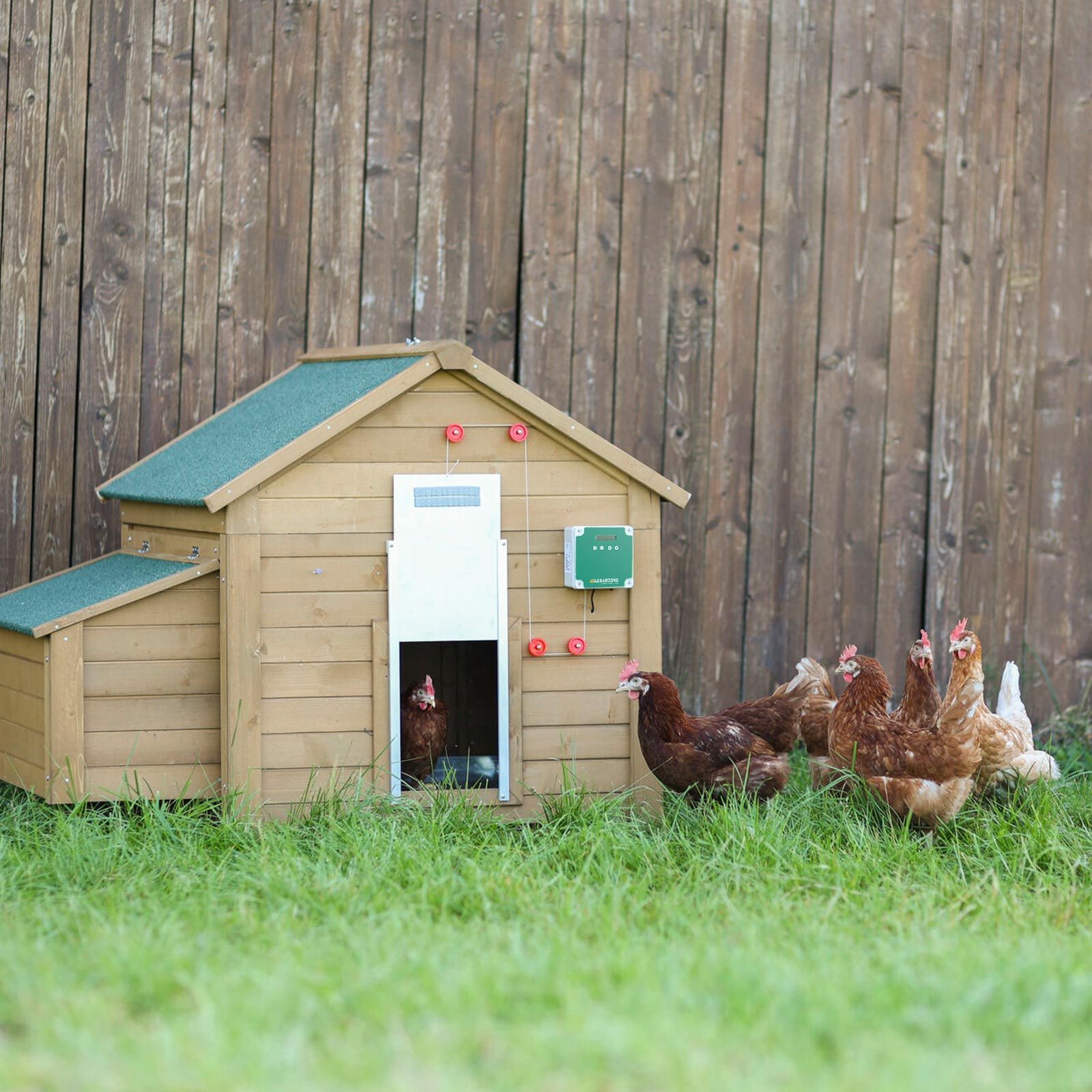 - Automatisk kycklinglucka med skjutreglage 43 x 40 cm (lämplig för kommersiell djurhållning enligt TierschNutztV).