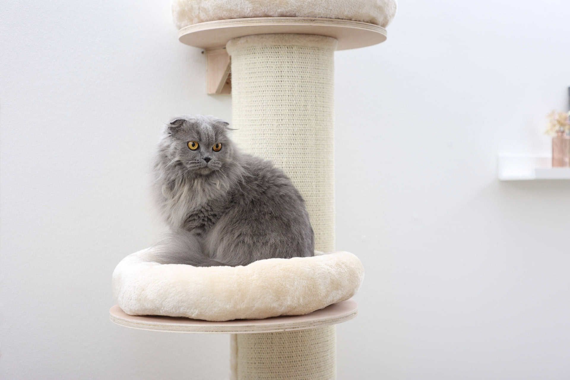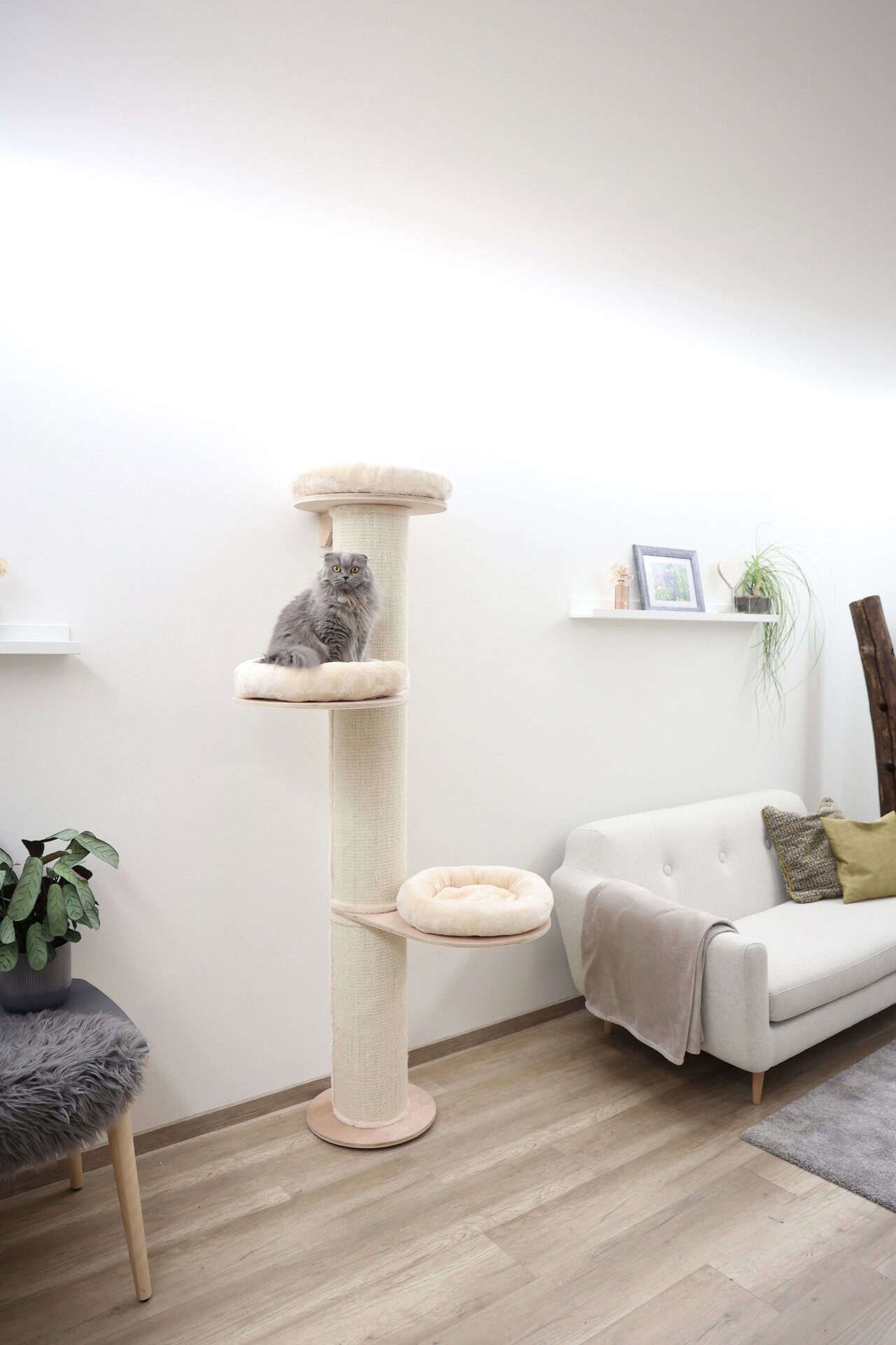 Det moderna katträdet Dolomit Tower är inte bara ett blickfång i vardagsrummet, utan också en mysig plats att leka och sova på - även för stora katter.