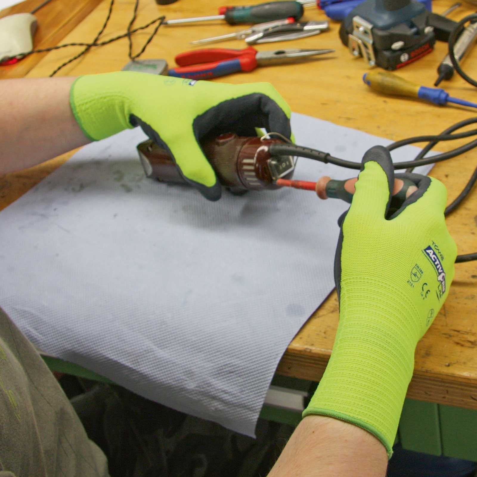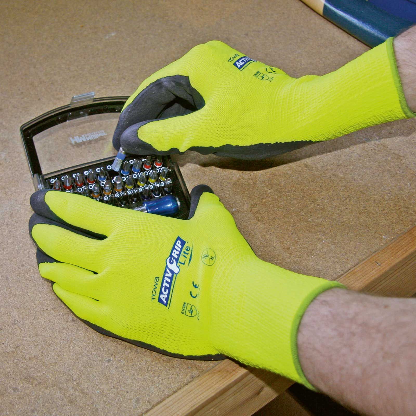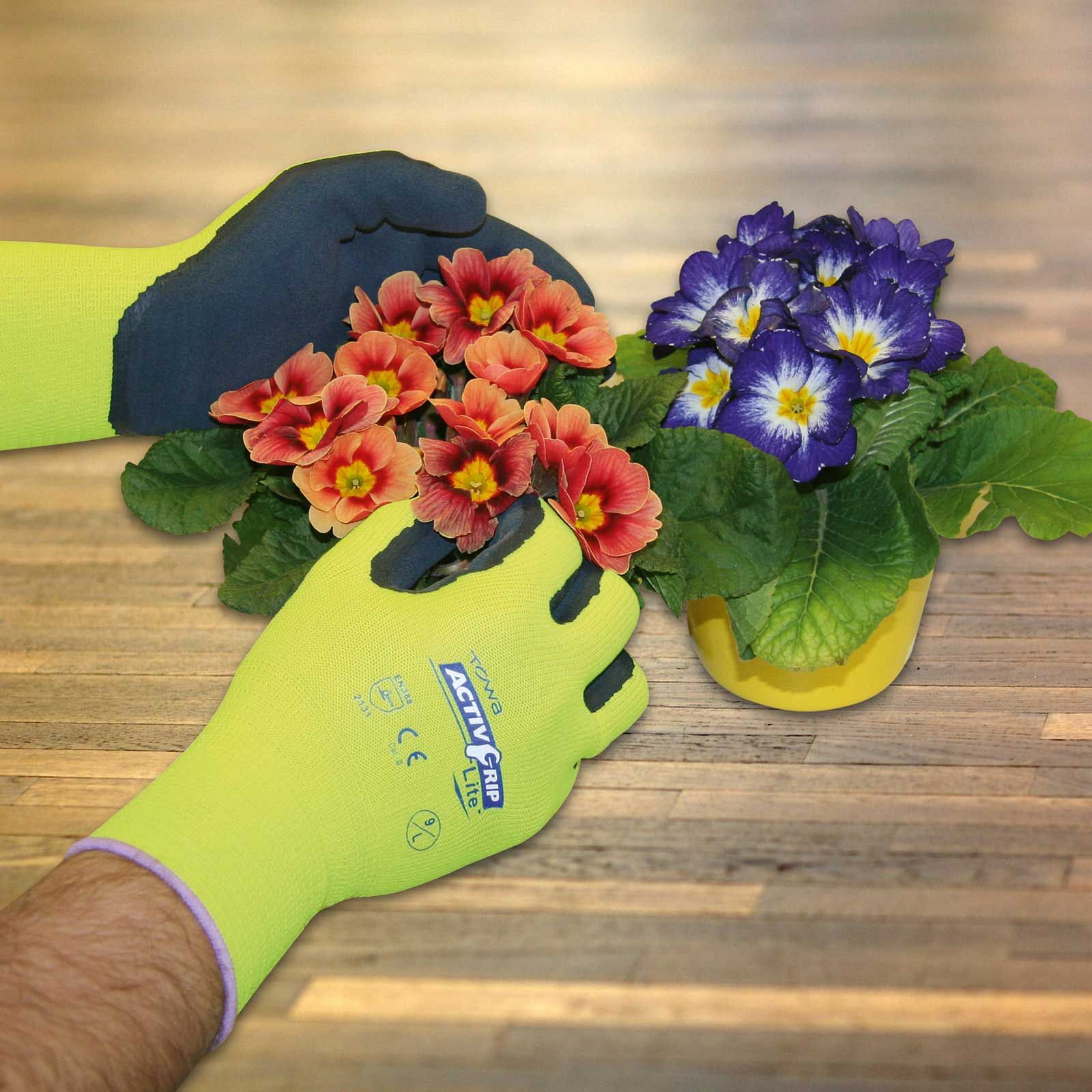Arbetshandskarna är doppade i latex för bästa halkskydd.