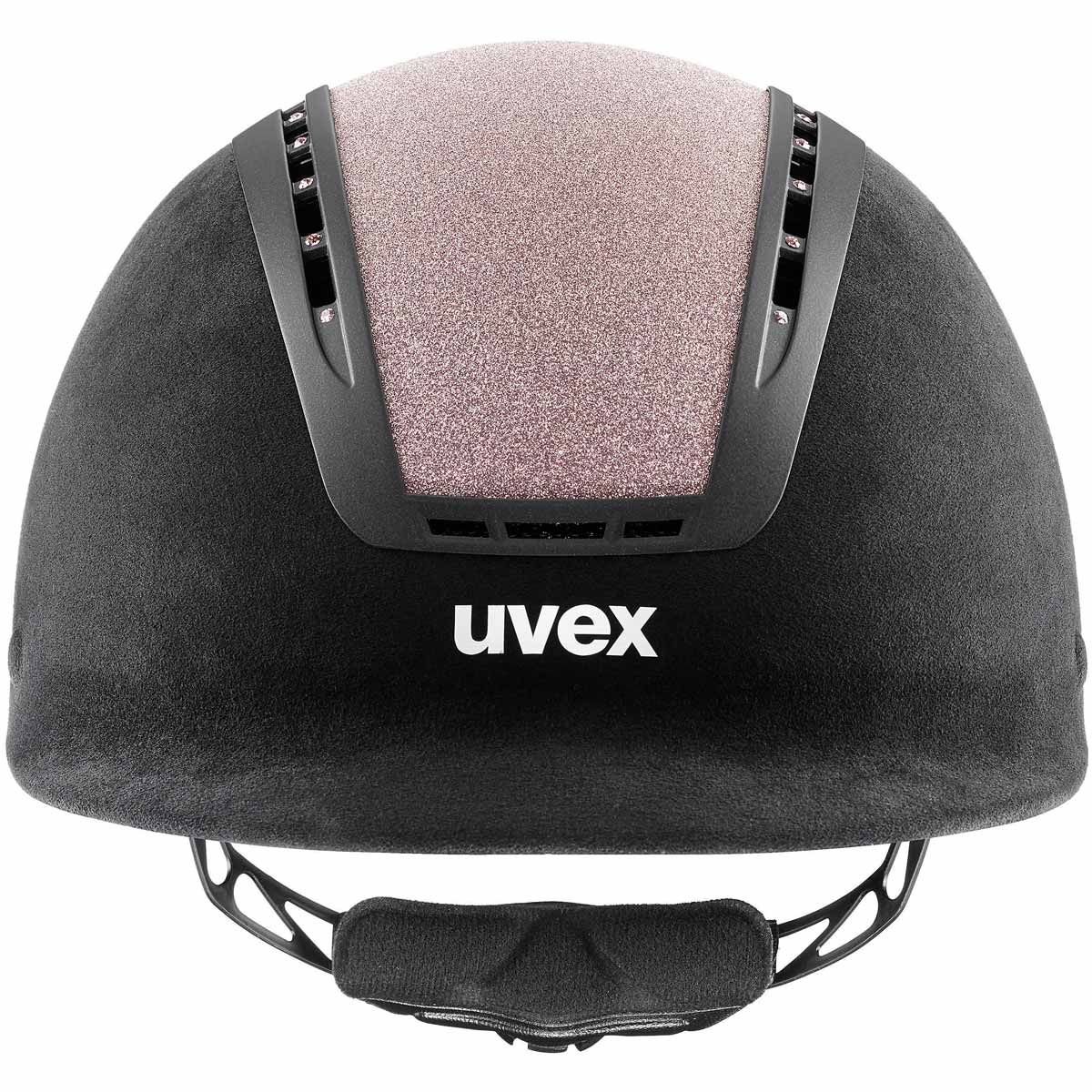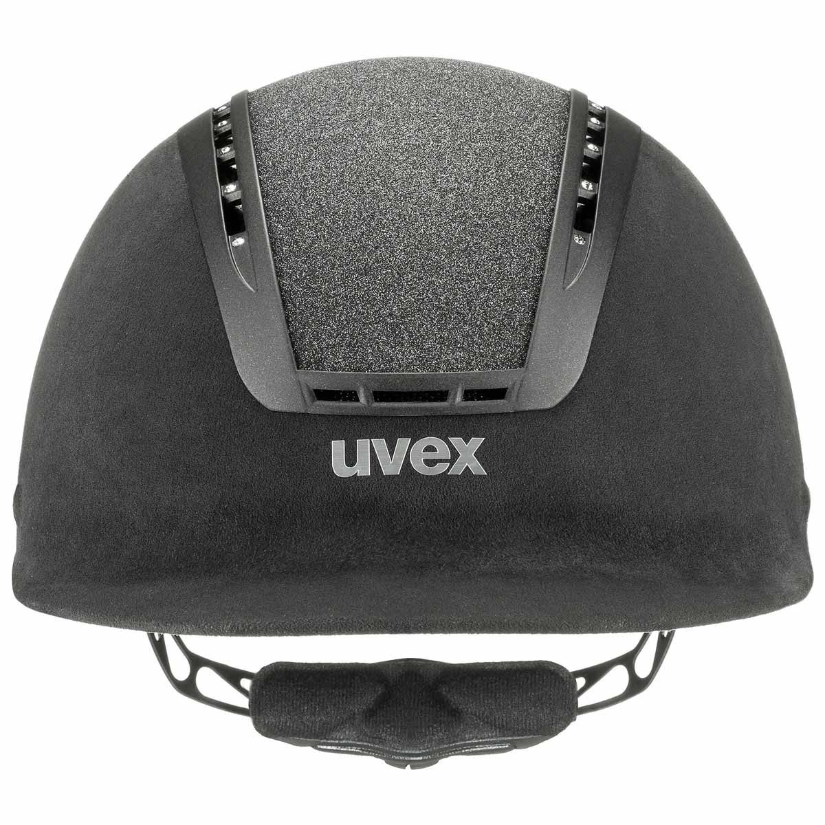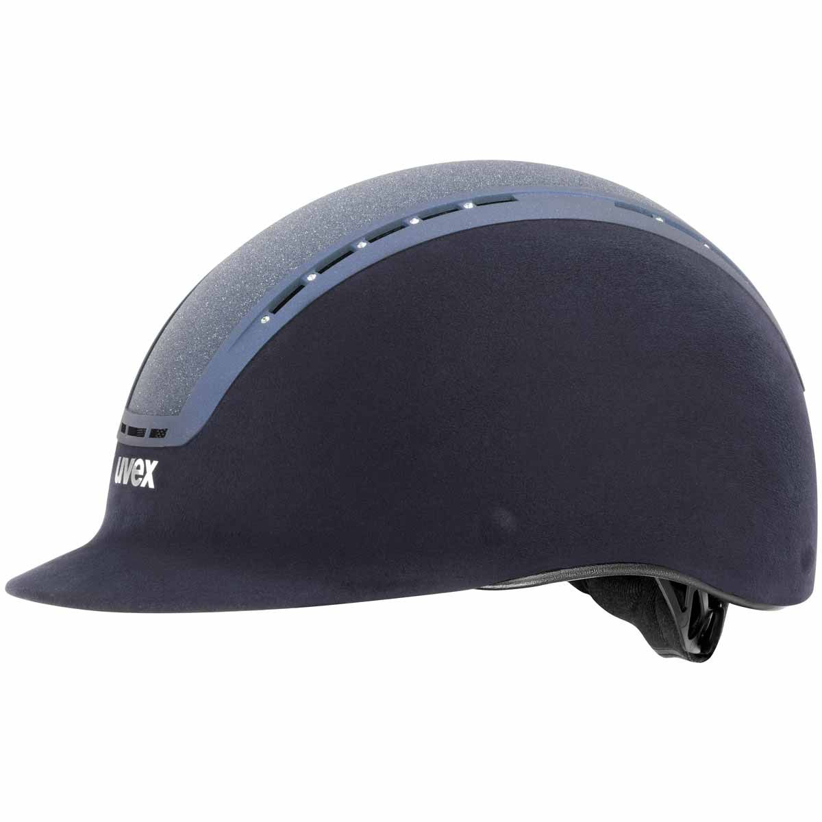 Ridhjälmen uvex suxxeed glamour övertygar med dyrbara Swarovski-kristaller och den glittrande Giltz-insatsen i kombination med svart imitationsvelour. Den här ridhjälmen har naturligtvis också högsta säkerhetsstandard.