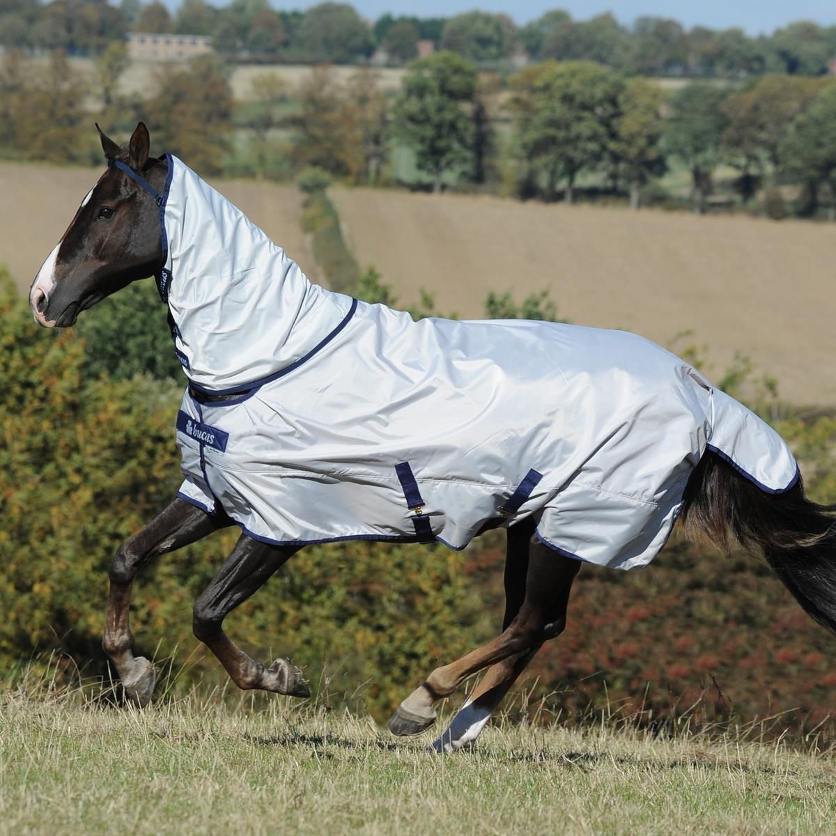 Bucas Sun Shower är en lätt regnmatta som är ett utmärkt alternativ när andra mattor är för varma och tunga. Sun Shower ger optimalt skydd mot regn och solstrålar samtidigt: Det lätta vattentäta och andningsbara materialet i solreflekterande färg (silver) skyddar inte bara mot genomträngande väta utan även mot överhettning av hästen. Det speciella nätfodret, som också är bearbetat, säkerställer också en optimal luftcirkulation.