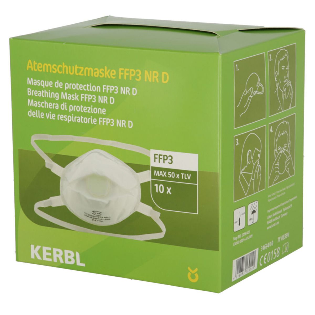 Partikelfiltrerande halvmask för personligt och yrkesmässigt skydd mot droppar och aerosoler.