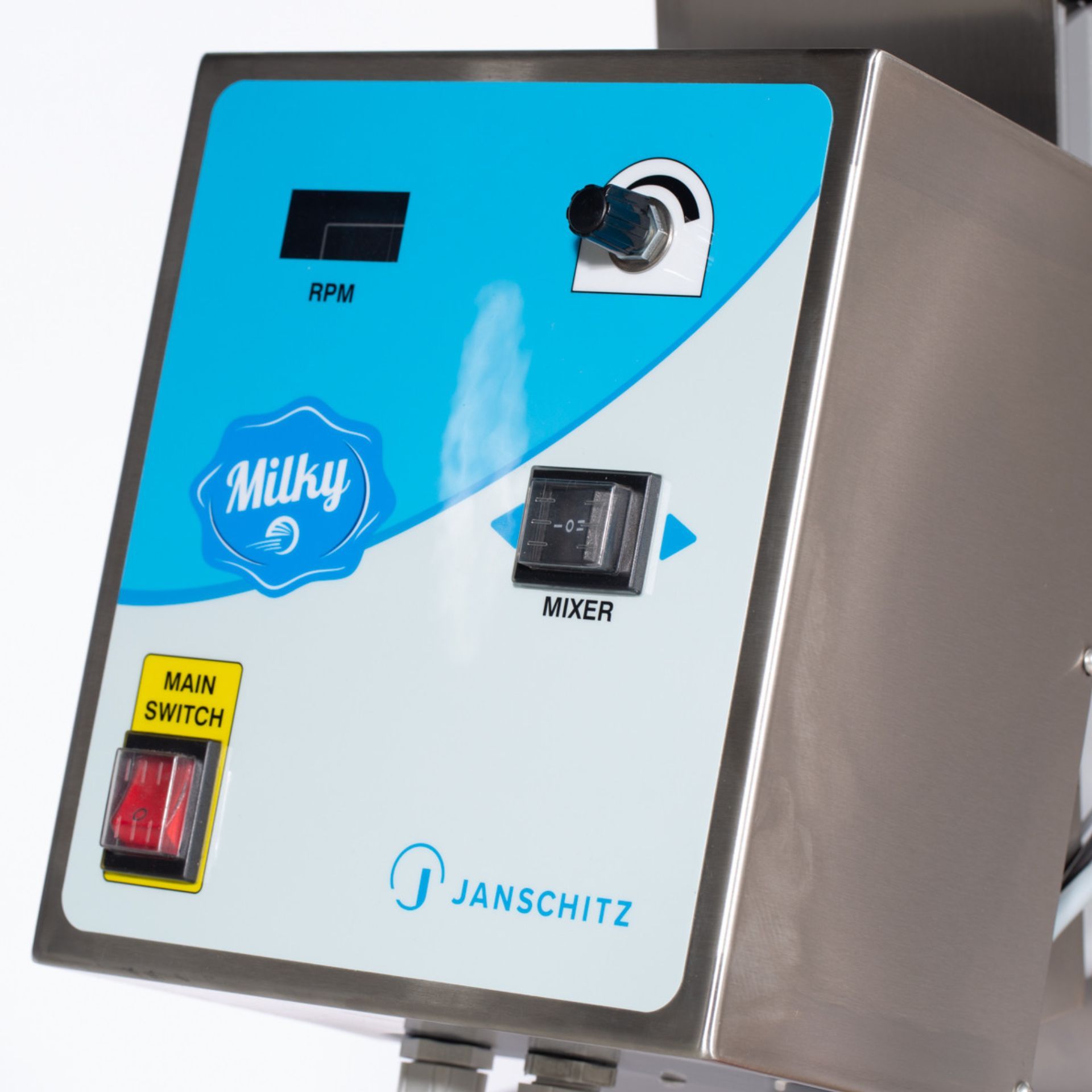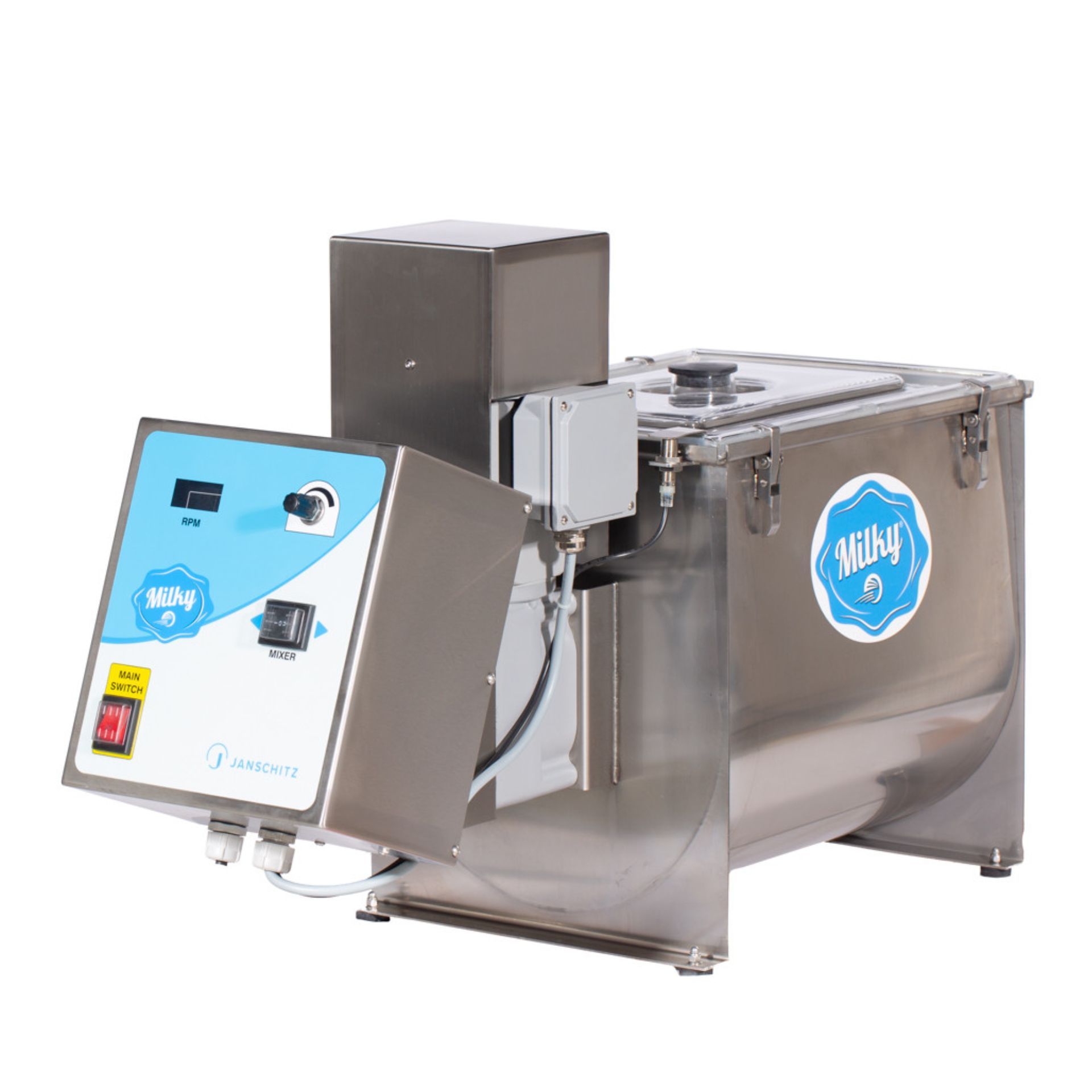 Den elektriska Milky smörmaskinen FJ 32/ 230V för professionell användning! Beroende på gräddtemperaturen och fetthalten i mjölken behöver Milky FJ 32 mellan 20 och 35 minuter för en process. Fyll 6-13 liter grädde i 32-litersbehållaren i rostfritt stål (max. upp till den avtagbara rostfria stålomrörarens omrörningsaxel) och börja kärna.
