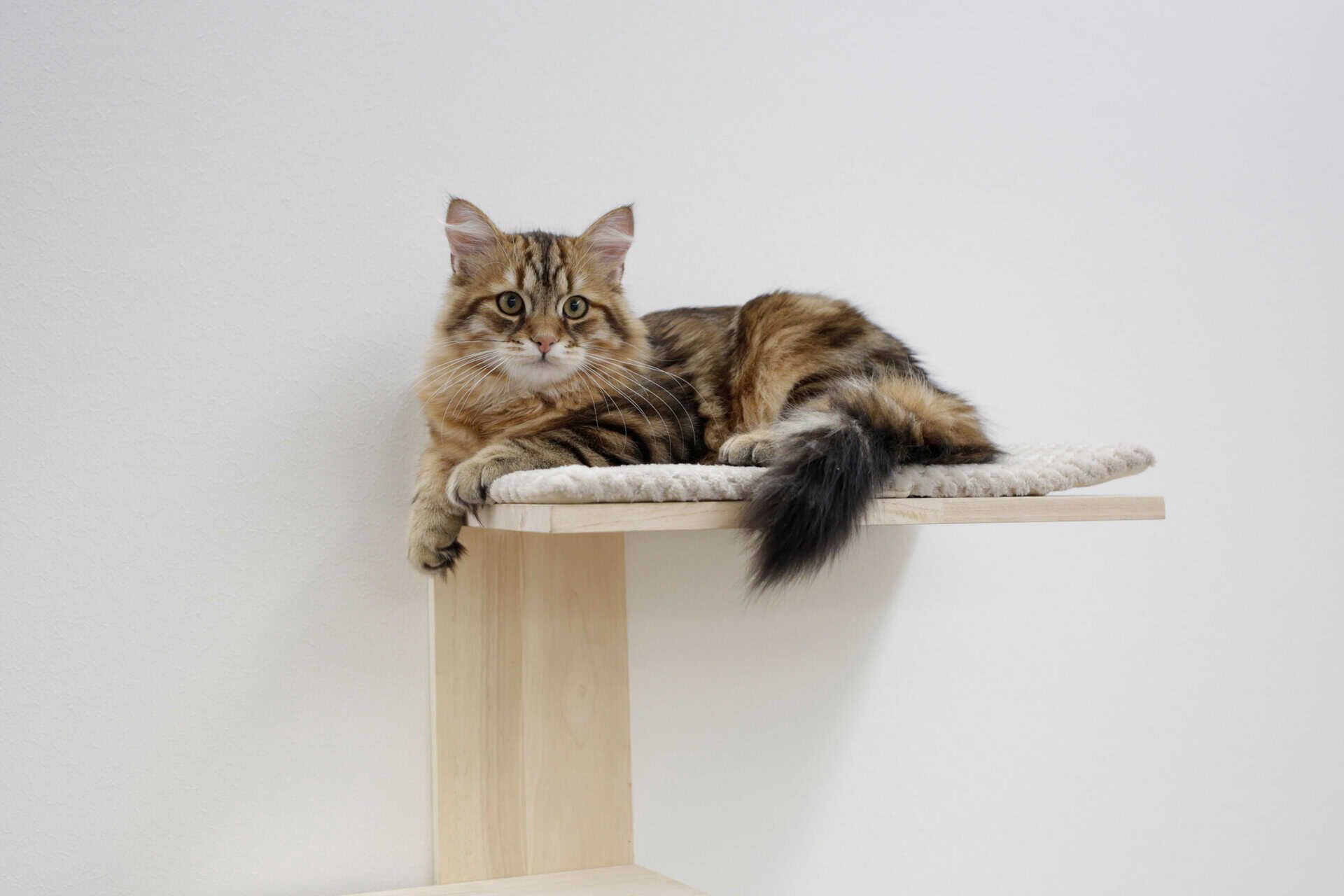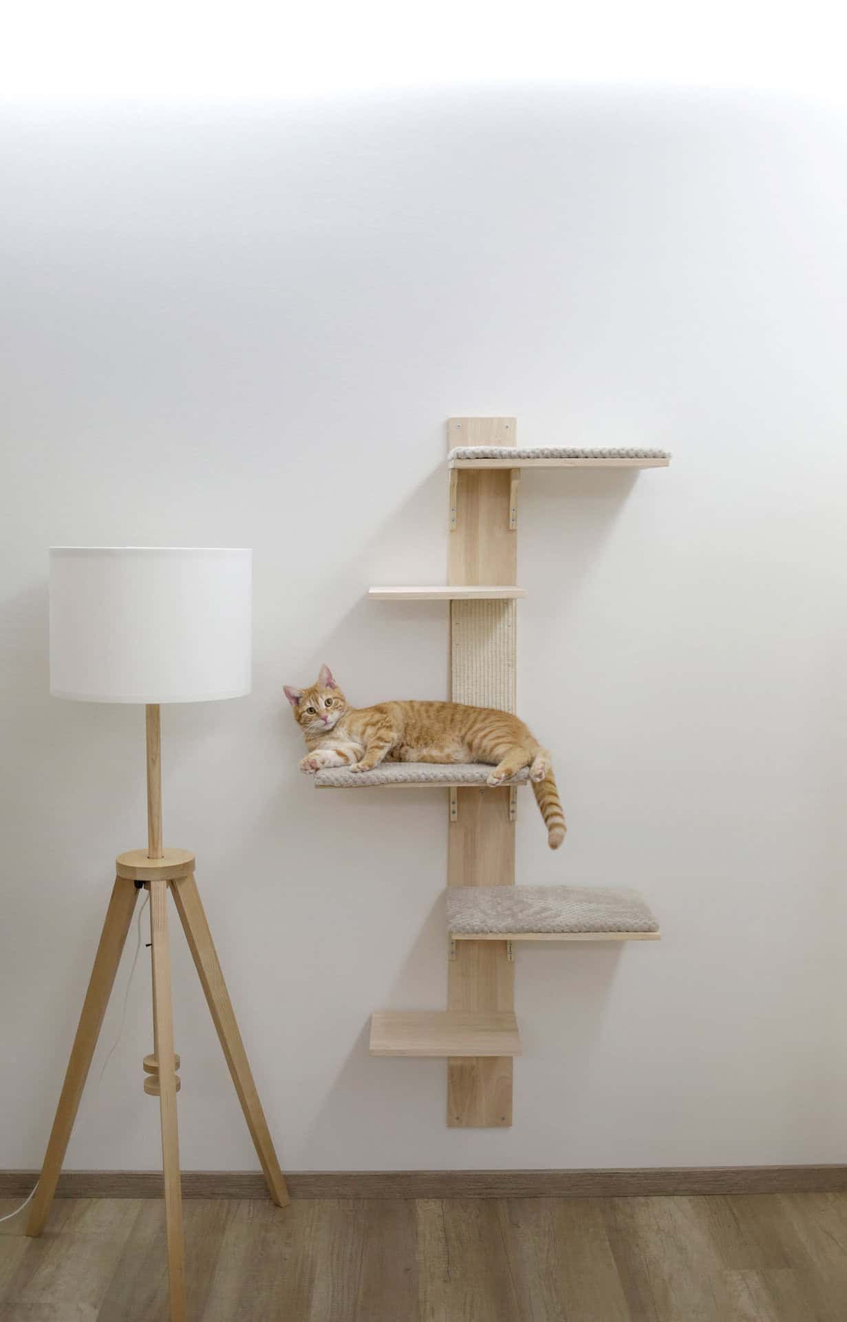 Den utrymmesbesparande och moderna designen av kattskrapstolpen erbjuder din katt många olika alternativ för att klättra, leka och sova. Att placera den på väggen ger mer ledigt utrymme på golvet och sparar samtidigt utrymme. Kuddarna går att ta av och kan tvättas i 30°C.