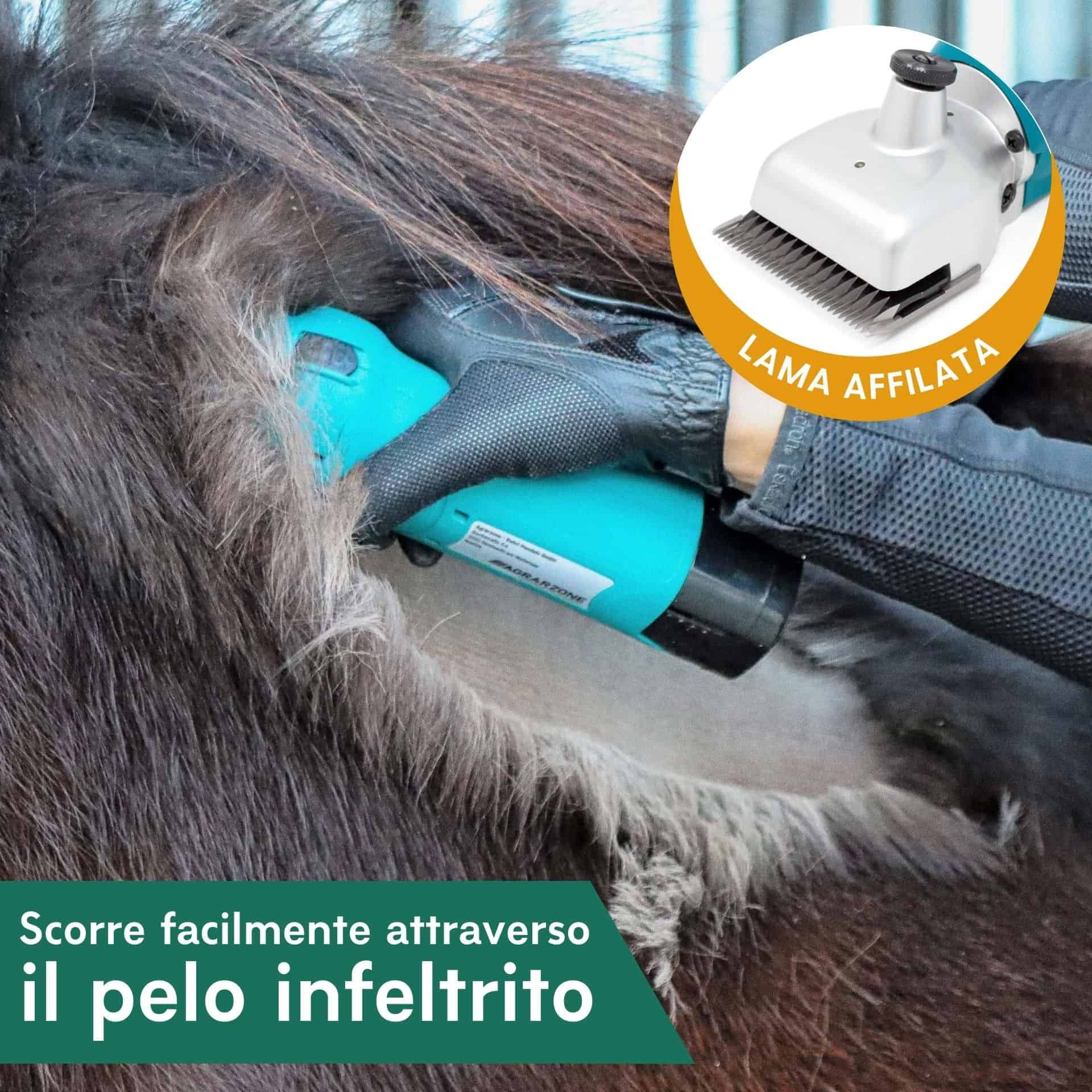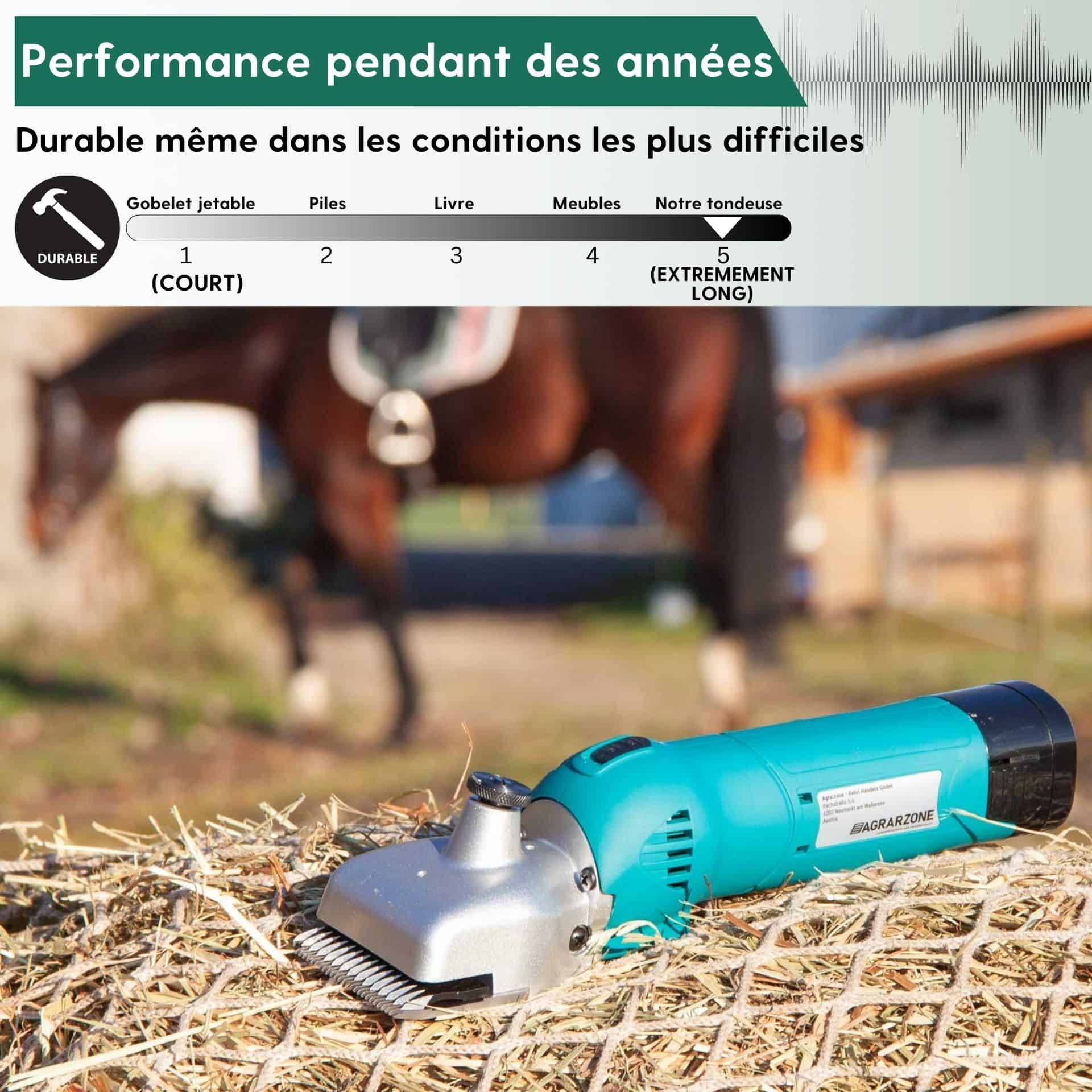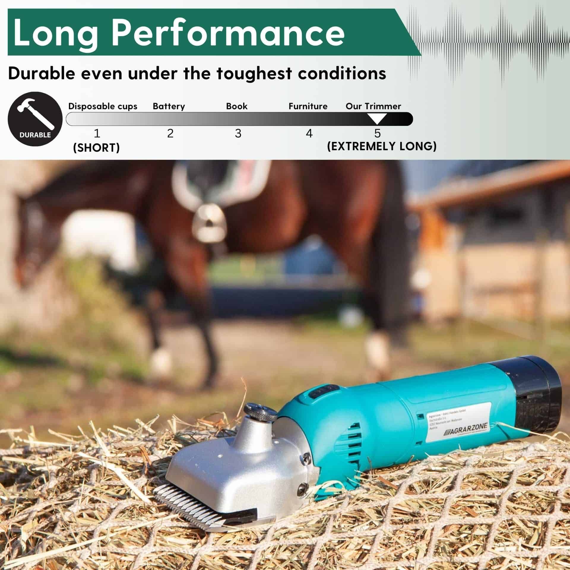 Med Agrarzones nya klippmaskin PowerCut Battery kan du klippa din häst utan irriterande elkabel, exakt och snabbt. Klippmaskinen övertygar med sitt mycket goda pris-/prestandaförhållande och de två 14,4 volts litiumjon-blockbatterierna. Tack vare de två 14,4 volts litiumblockbatterierna är det möjligt att klippa nonstop utan nätström. Den kraftfulla 45-wattsmotorn ger en exceptionellt hög effekt på 2300 slag per minut och är inte på något sätt sämre än nätdrivna modeller.