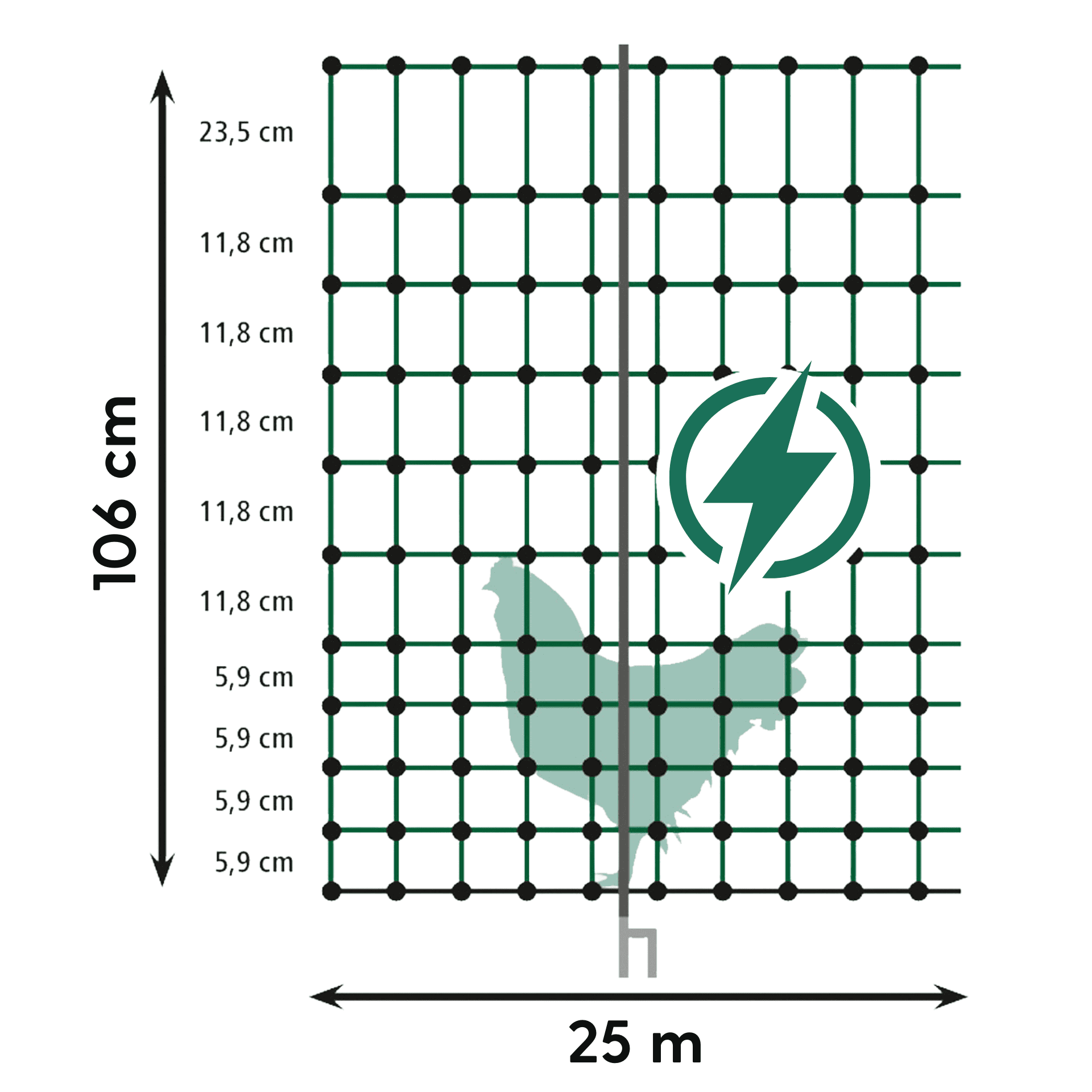 Det stabila 106 cm höga hönsnätet har en längd på 15 meter. Detta gör det enkelt att stänga in mycket små områden och korta avstånd eller passager utan att behöva korta ner ett långt nät eller lämna en del av nätet ihoprullat.