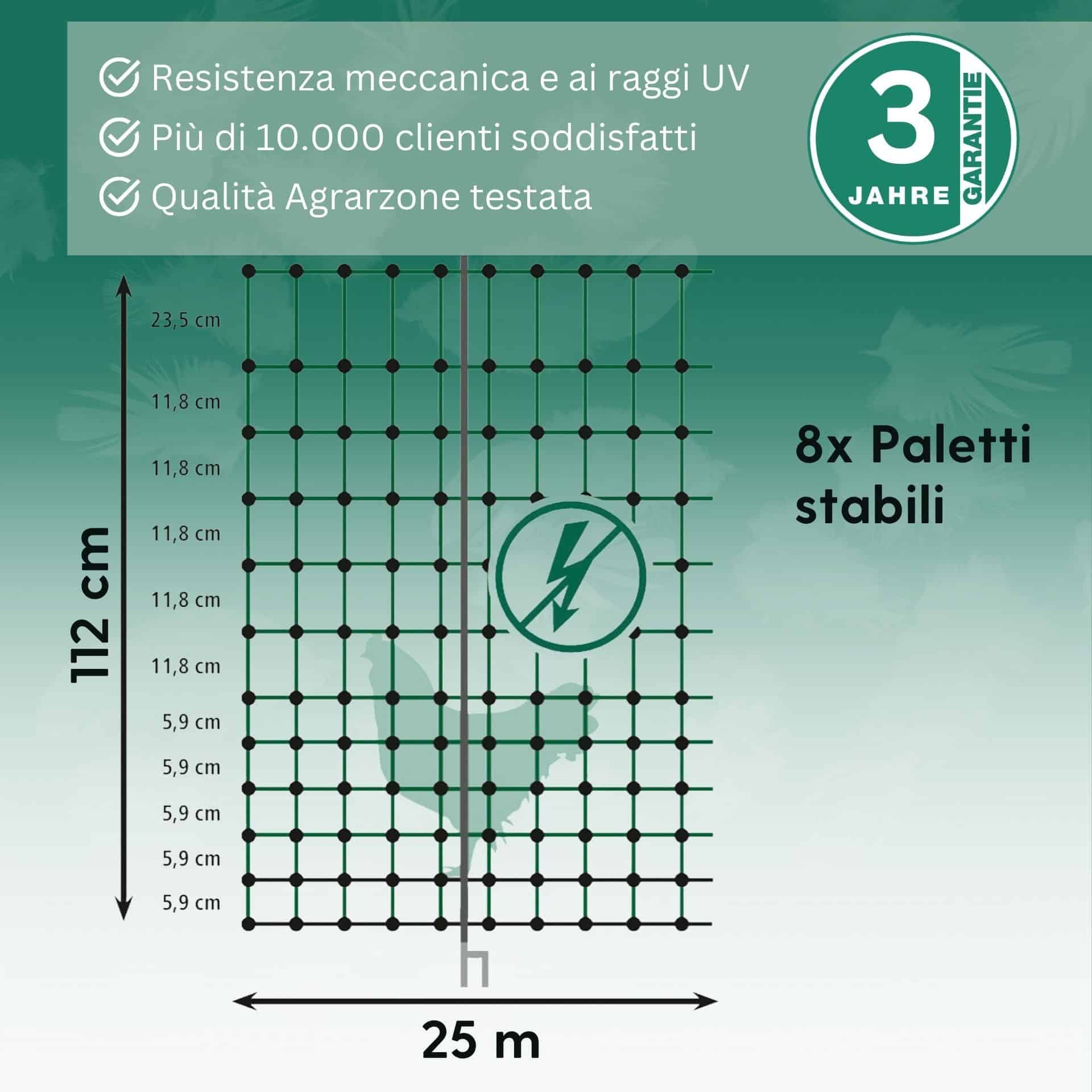 - 25 m x 112 cm, 8 stolpar, 8x stabila plaststolpar, 4x markankare, 8x markstoppare, 1x stängselanslutning, 1x reparationssats