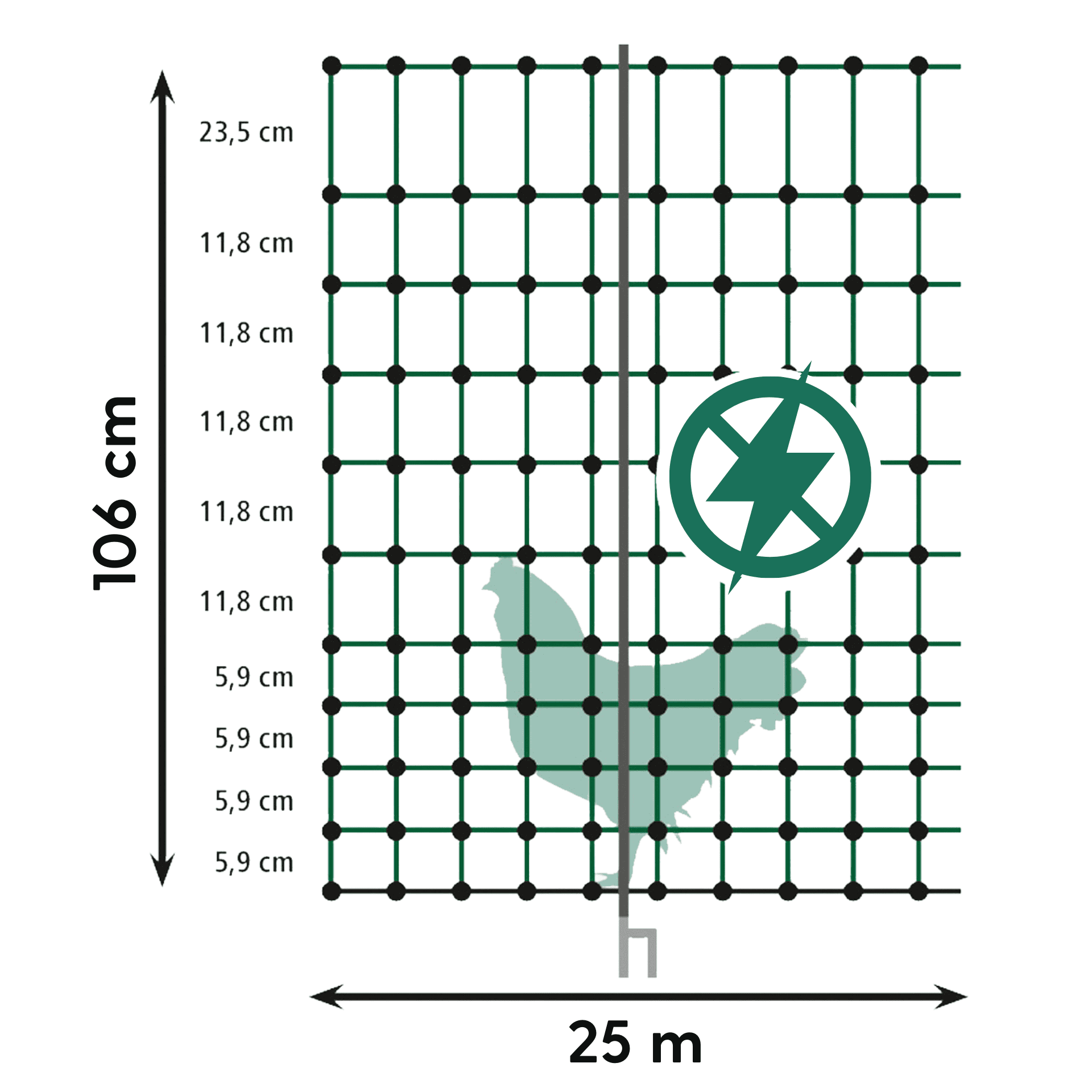 - 25 m x 106 cm, 8x stabila plaststolpar, 4x markankare, 8x markstoppare, 1x stängselanslutning, 1x reparationssats