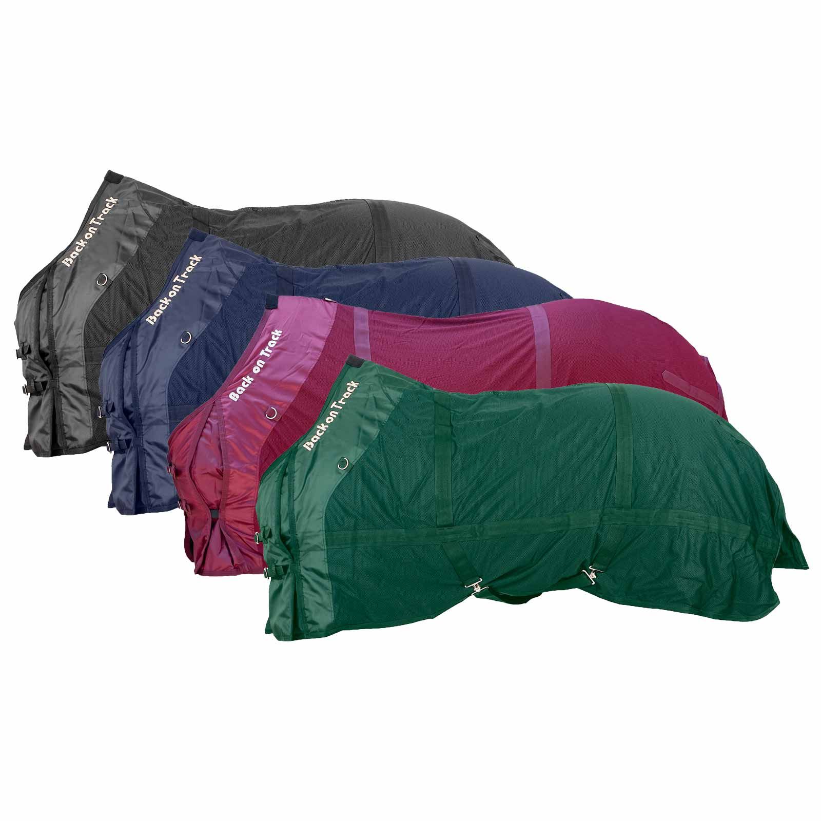 För komfort har mattan ett foder av vävd päls vid skänkeln och en dubbel stängning framtill och korsband för optimal passform. Back on Track-täcket har kilar, en svansklapp , en svansrem och ringar för att fästa benremmar, vilket gör att inget lämnas att önska. Tack vare det lätt elastiska materialet har det här täcket en mycket bra passform.