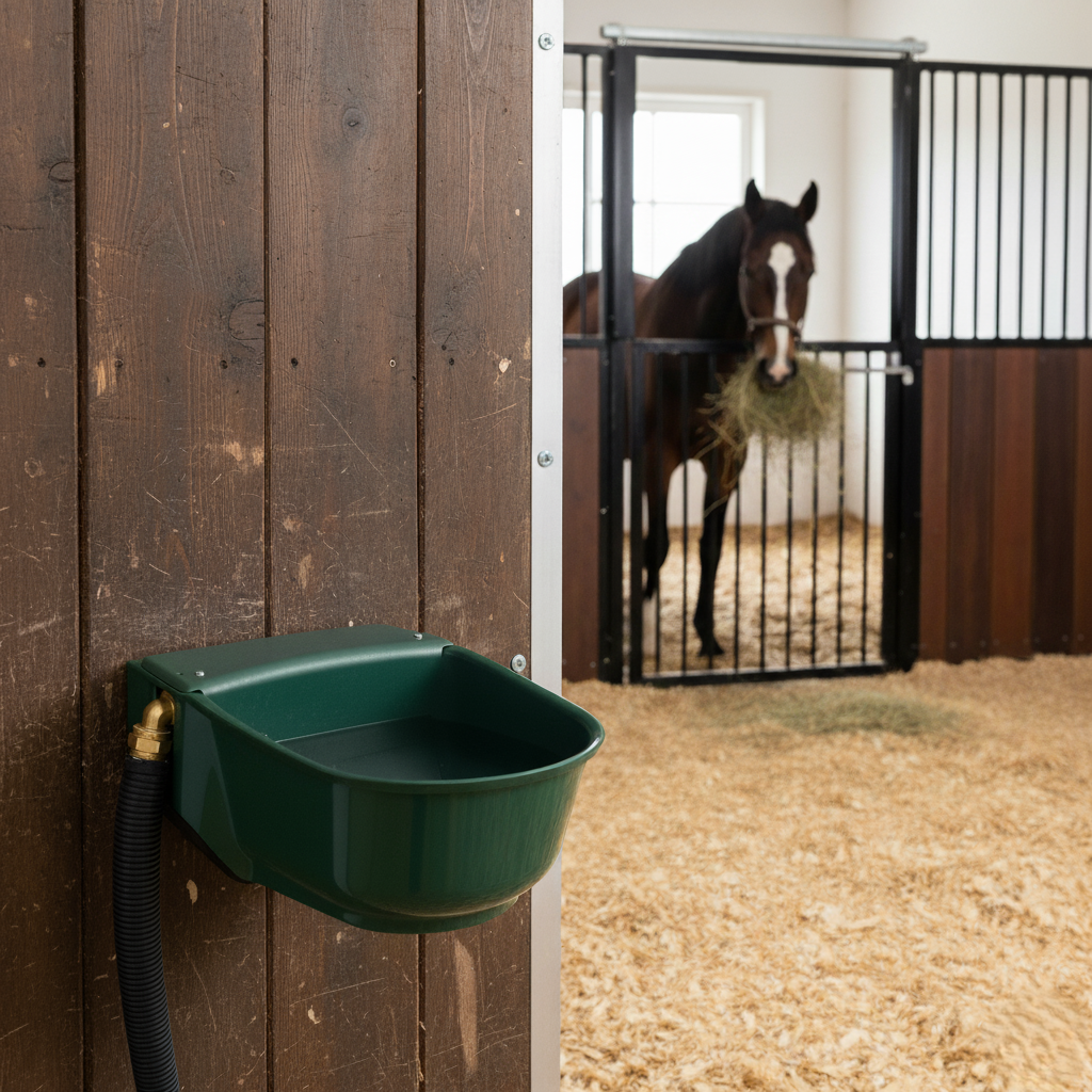 Den uppvärmbara vattenkoppen för nötkreatur och hästar av högkvalitativ plast är frostbeständig ner till ca -25 °C. Dricksskålen har en integrerad och lätt utbytbar värmekabel och en extra värmekabel för ett ca 2 meter långt rör. Den likaledes integrerade, externa frostskyddstermostaten slår på värmekabeln vid +3 °C och stänger av den vid ca +13 °C. Kåpan på drickskålens undersida och den slutna konstruktionen vid ventilintaget har en isolerande effekt och förhindrar att värmen som avges av värmekabeln läcker ut.