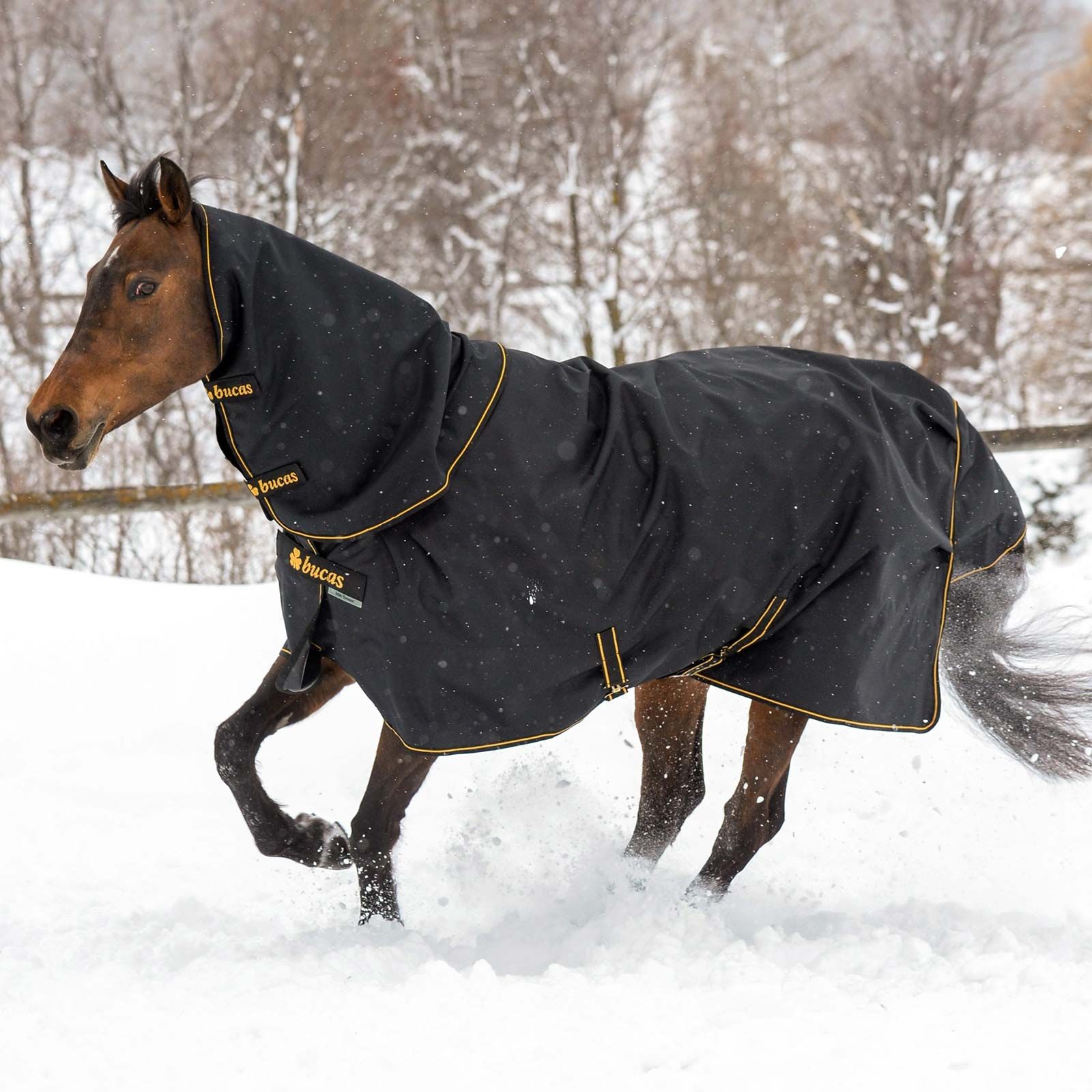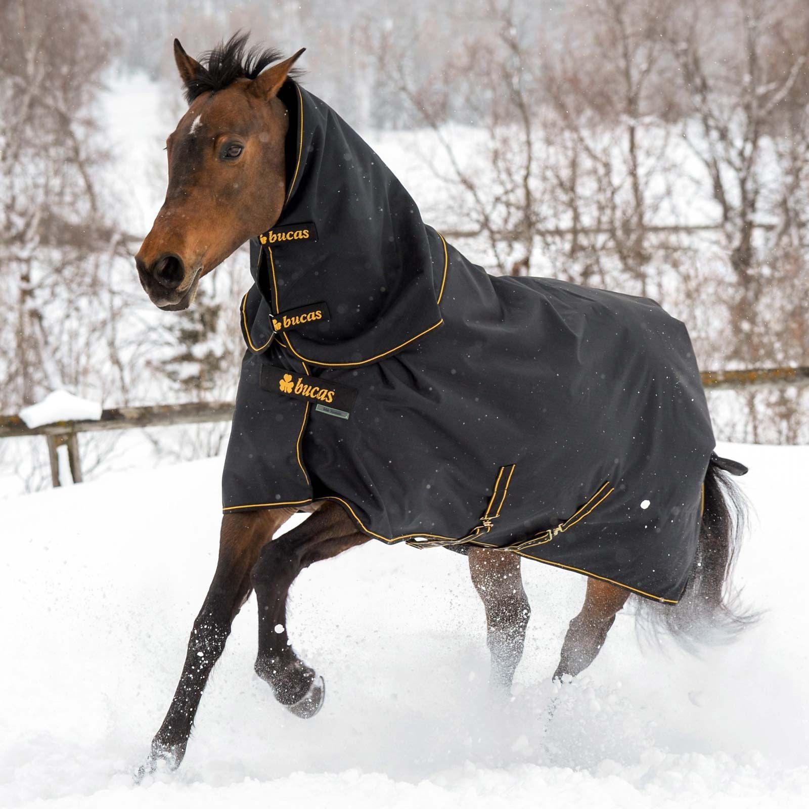 Med Bucas Irish halsduk är hästen dessutom skyddad från väder och vind. Bucas Irish Turnout är vattentät, andningsbar och har ett slitstarkt "Rip-stop"-yttermaterial. Det andningsbara "Silk-feel"-fodret ger hästen hög komfort.