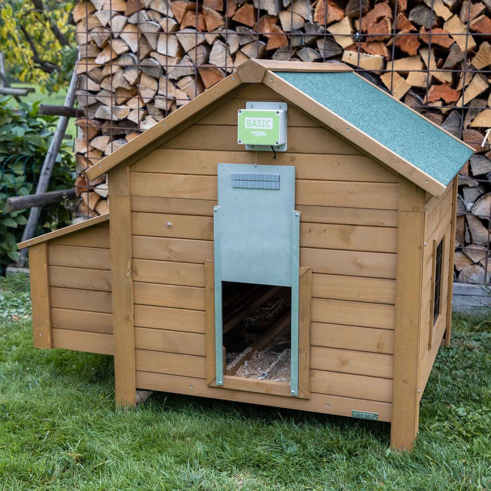 Med den automatiska hönslucka Basic blir det ännu enklare och bekvämare att ta hand om dina höns. Tack vare den dagsljusberoende styrsystem med ljussensor öppnas och stängs kycklingluckan automatiskt utan att du behöver göra något. Ljussensorn med 1 m kabellängd möjliggör flexible installation av styrningen inomhus.
