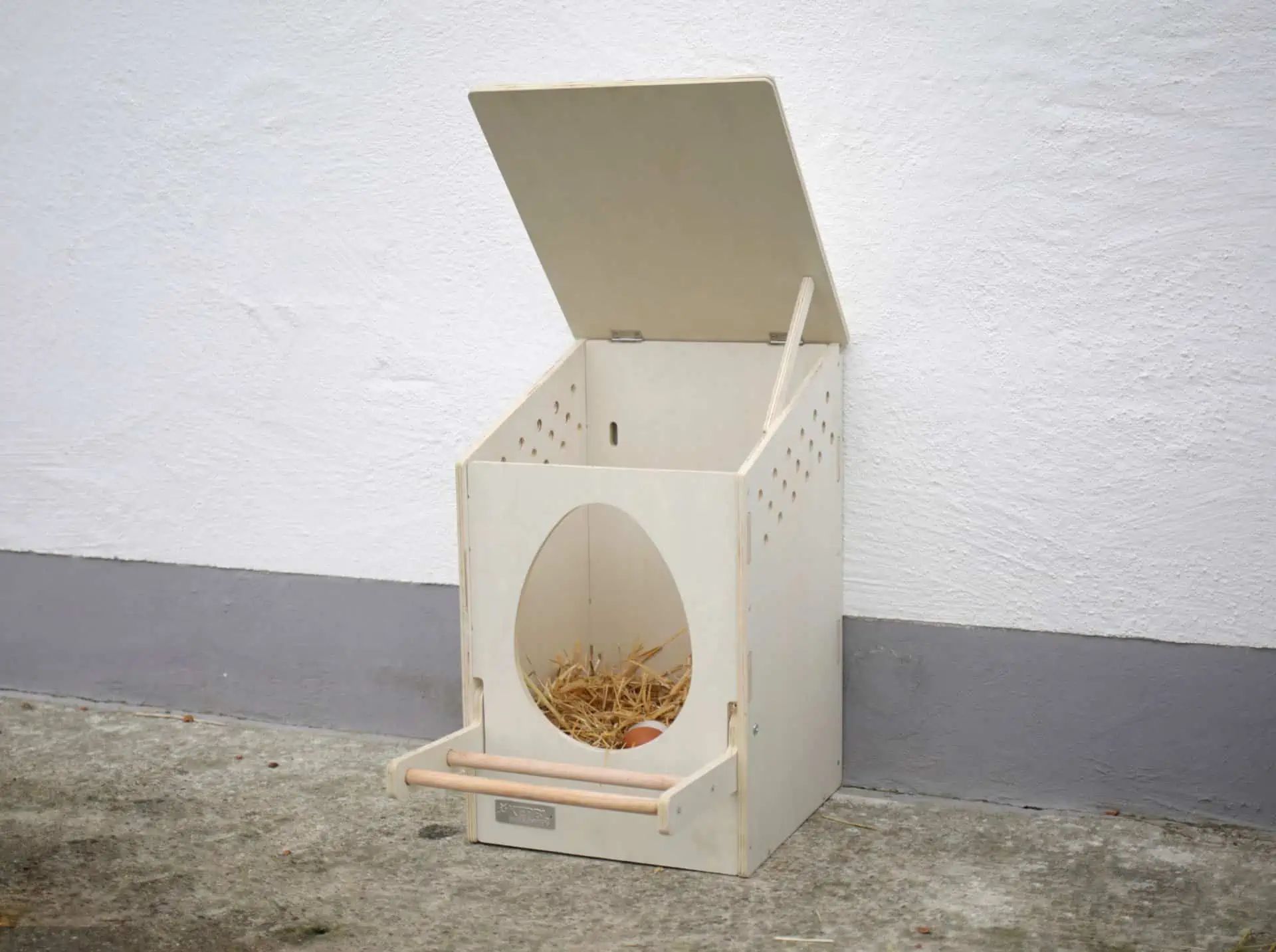tillverkat av robust trä, lagningen av skiktet erbjuder en mängd fördelar: det har en tangoöppning som kan stängas under natten, ventilationsöppningar för luftcirkulation och för att förhindra kondens inuti. Dessutom kan taket fällas ner för enkel rengöring, och den stigande taket förhindrar att kycklingar klättrar. Tack vare dess konstruktion kan den också hängas upp och placeras på olika platser.