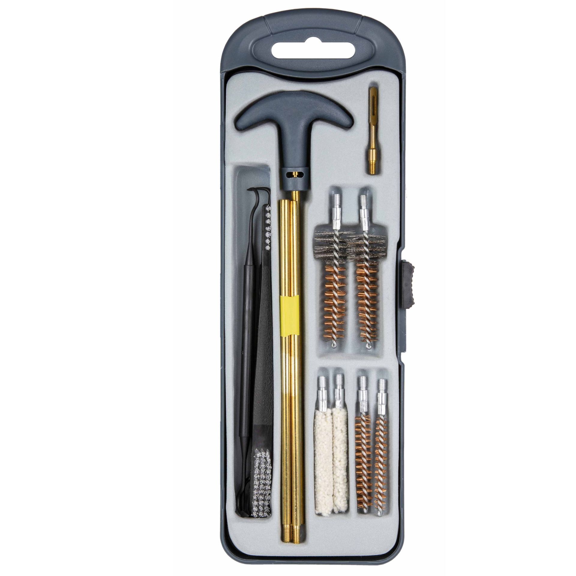 satsen innehåller en fyrstegs rengöringsstång gjord av mässing med en T-handtag för enkel hantering. Den innehåller två fosforbronsborstar (.22, .30), två fosfor- och stålborstar (.22, .30), två ullborstar för en mild rengöring (.22, .30), en spårspets gjord av mässing och en Dubbelsidig nylonborste för en grundlig rengöring. Satsen kompletteras av två nylonrengöringsmedel, som är oumbärliga för att nå hårda -till -återlämnande områden.