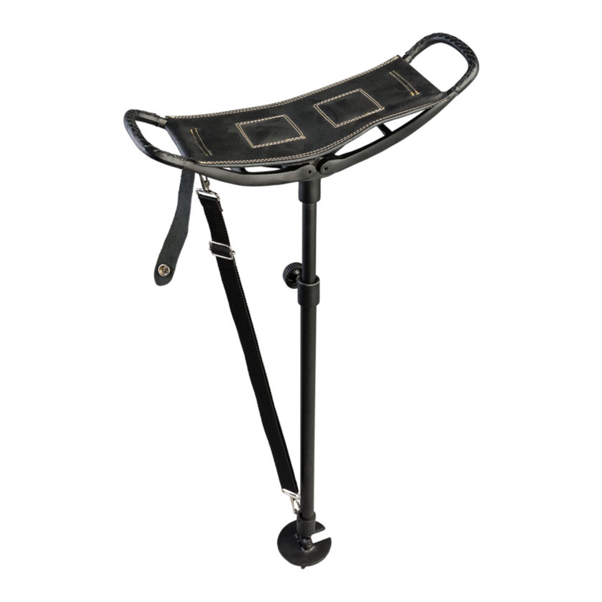 Det som utmärker denna käpp är dess smarta två-i-ett-funktion. Handtaget kan fällas ut och blir då en bekväm sits av 100% buffelläder med måtten 26 x 12 cm. Sitthöjden är justerbar mellan 54 och 75 cm och passar personer av olika längd. En integrerad metallplatta fungerar som sjunkskydd och ger stabilt fäste även på mjukt underlag.