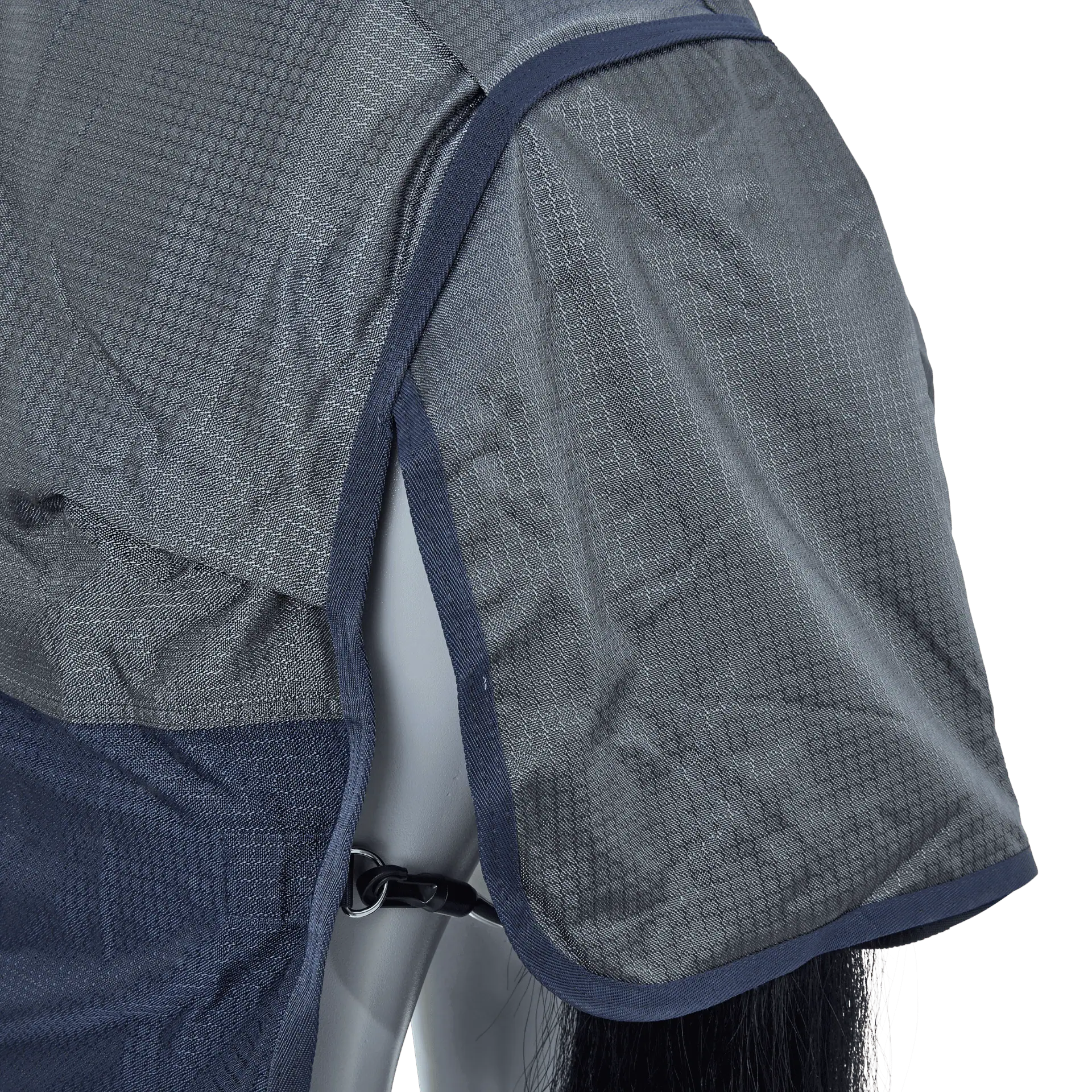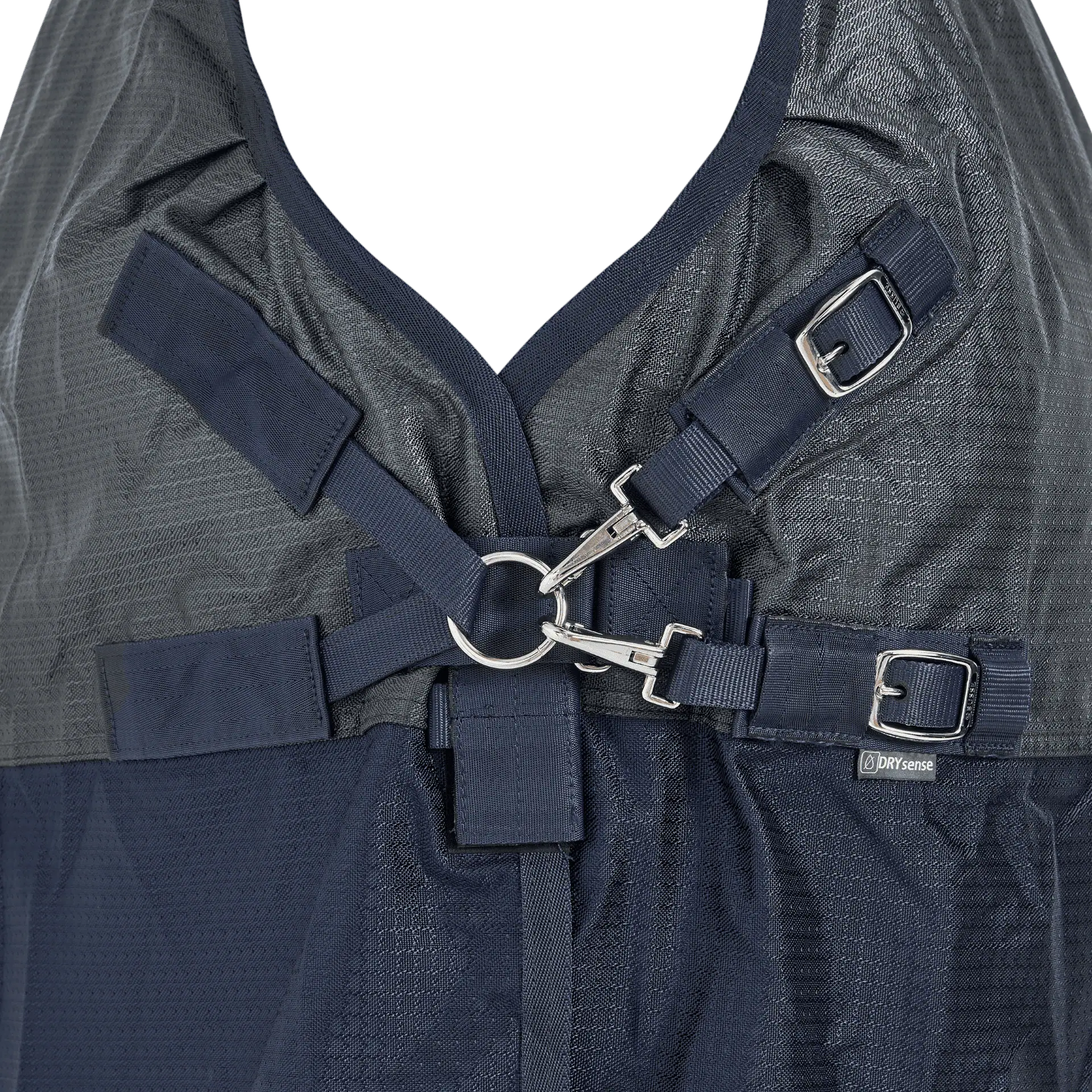 Extremt hållbart, extra tårresistent och funktionellt utomhusmaterial: 840 Nylon dubbel ripstop utgör grunden för detta tak. Inuti säkerställer Drysense-fodret, en särskilt pälsvänlig och snabbtorkande polyestervävnad, att kondensation undviks och taket inte är klamt från insidan, även om den tas av från hästen däremellan. En mycket lätt termisk isolering på 50 g polyfill säkerställer trevlig värme. Vattentätheten för det övre materialet är 5000 mm, medan andningsaktiviteten är 3000 g/m²/24 timmar, vilket bidrar till vindtätheten.