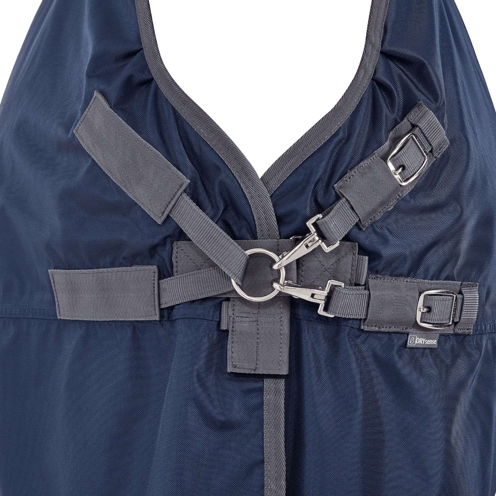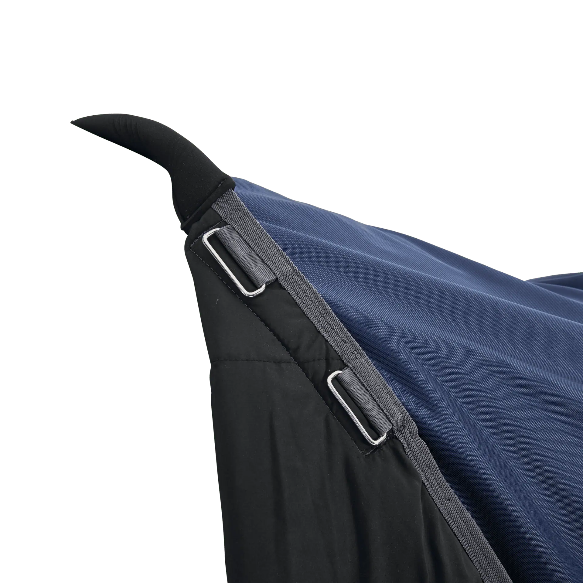 Tack vare sitt extremt hållbara och funktionella yttre material från 840 The Nylon , erbjuder den flexibla Pro 250 maximal hållbarhet och hållbarhet. En medellång värmeisolering av 250 g polyfill bidrar till hästens välbefinnande och säkerställer termisk komfort. Drysense-fodret, en särskilt pälsvänlig och snabbtorkande polyestervävnad, säkerställer en mjuk torr känsla även med hög luftfuktighet och förhindrar taket från att få ravin från insidan. Med en andningsförmåga på 3000 g/m²/24H och en vattentäthet på 5000 mm är utomhustaket också vindtät och väderbeständig.