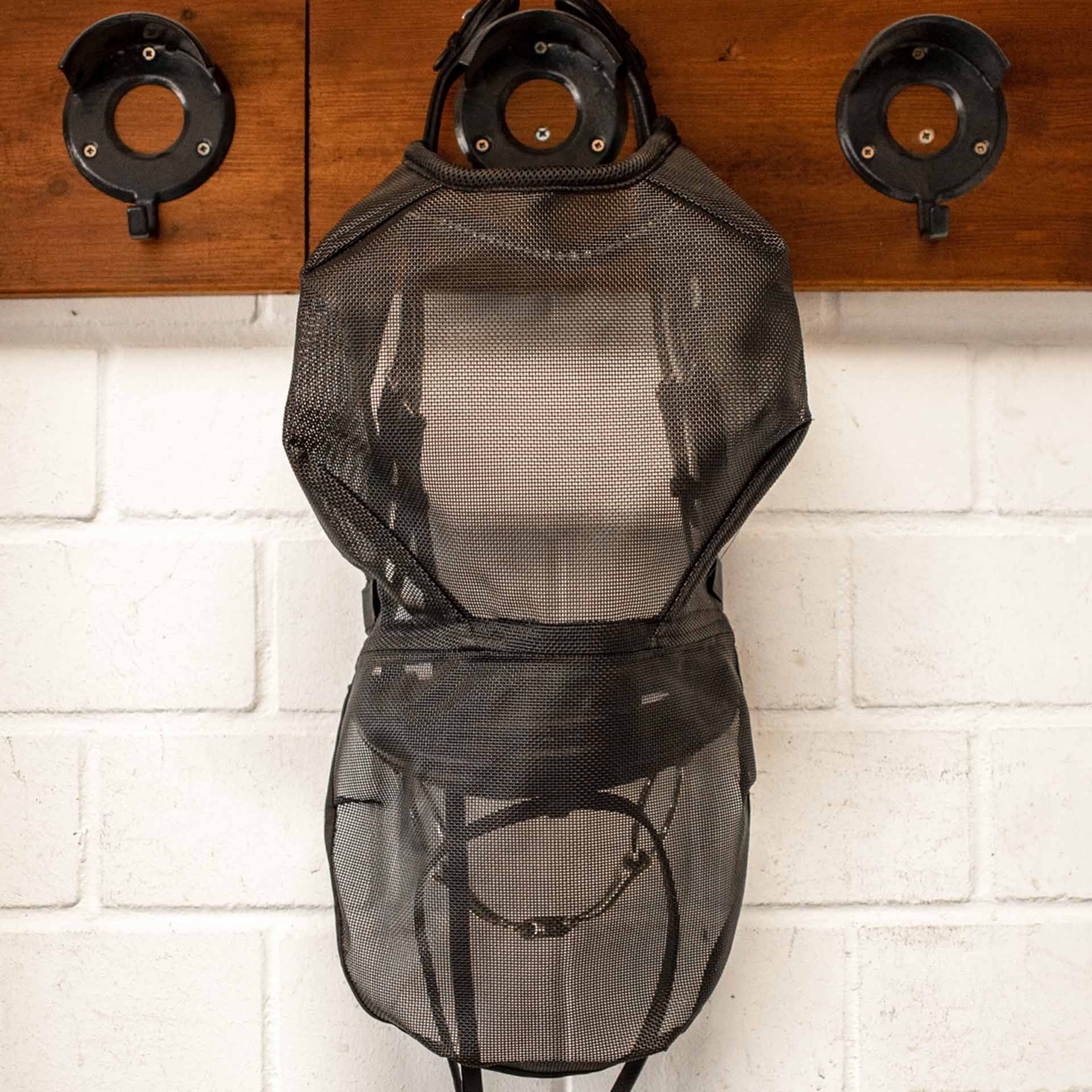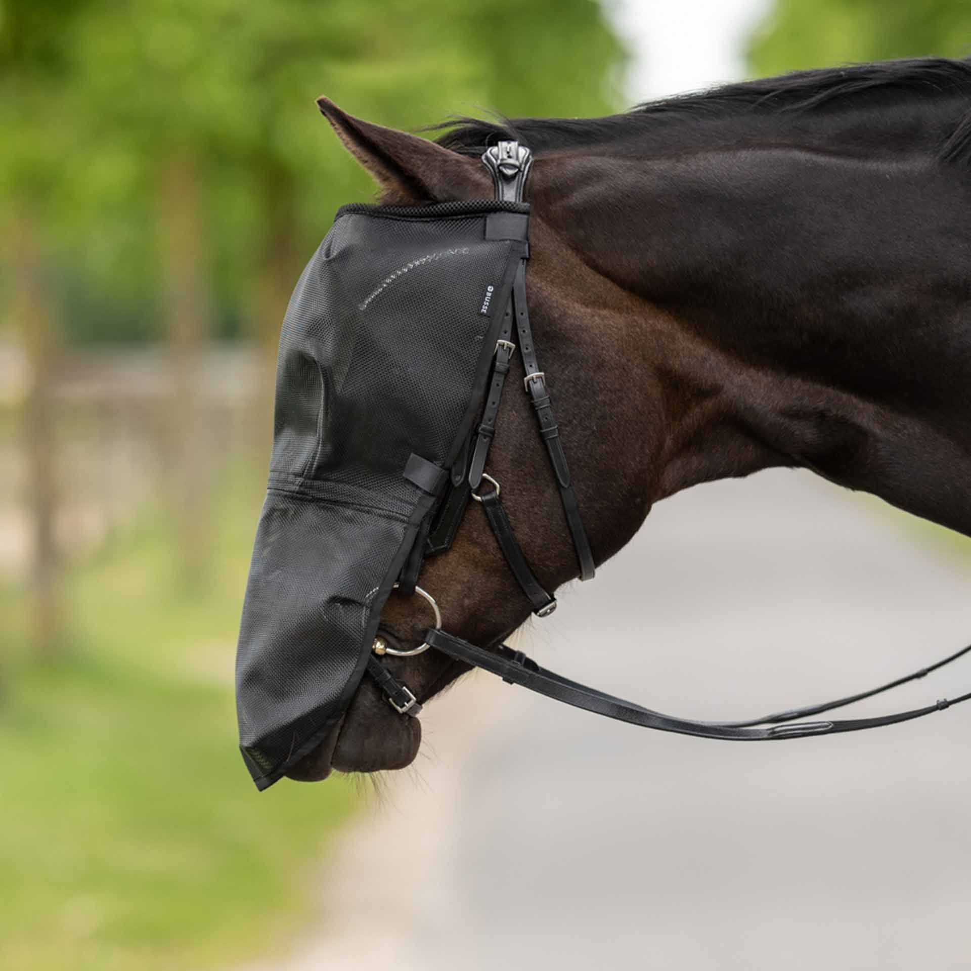 Flymasken är gjord av böjning av plastnätverk, som också bibehåller sin form och det tillhörande generösa avståndet till ögonen i rörelsen. Det består också av ett permanent integrerat Nuber -skydd som bidrar till att minska symtomen i huvudskakningssyndrom och allmän överkänslighet mot insekter. Med fyra kardborrfästelement kan denna mask fästas på sidbakningsremmarna på tränsen på nolltid och helt enkelt ta bort den om det behövs utan att du behöver gå ner - detta är särskilt praktiskt för turneringen eller kursen.
