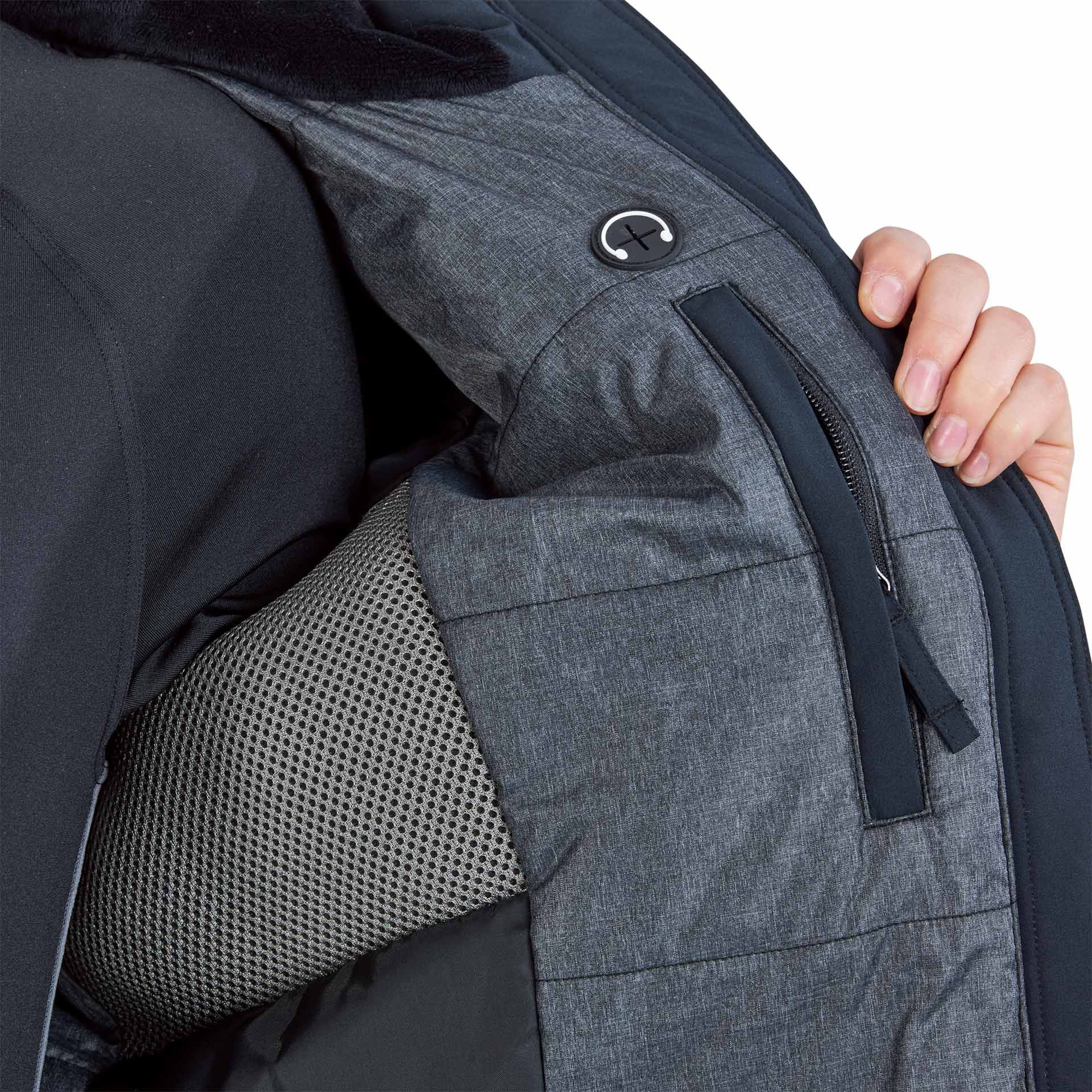 bussjacka Brenley Plus visar sig som en sportig belagd kortjacka med ribbade bundar och en fashionabelt melanched inre foder. Den består av ett vattentätt och andningsbart yttre material och har ett innovativt, elastiskt funktionellt membran, en lätt 3M -thinsulate® -fyllning och en mjuk syntetisk päls i den inre kragen.
