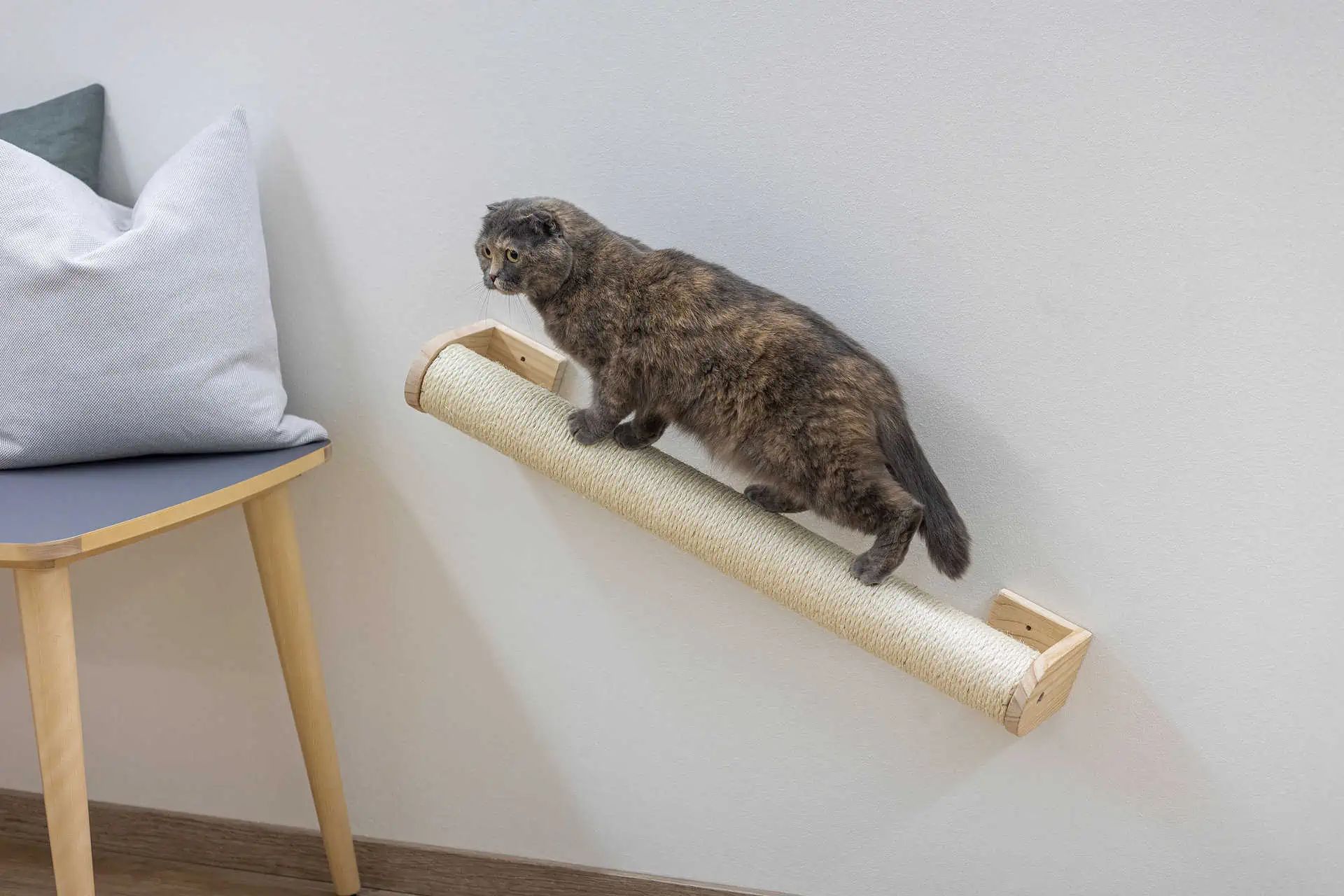 Väggskrappelaren är täckt med naturligt rep, som erbjuder en enastående yta för repor och bidrar till hälsan hos din kattklor. Det kan fästas individuellt på väggen, vare sig det är vertikalt eller horisontellt och erbjuder således flexibilitet när det gäller att anpassa sig till dess inredning.