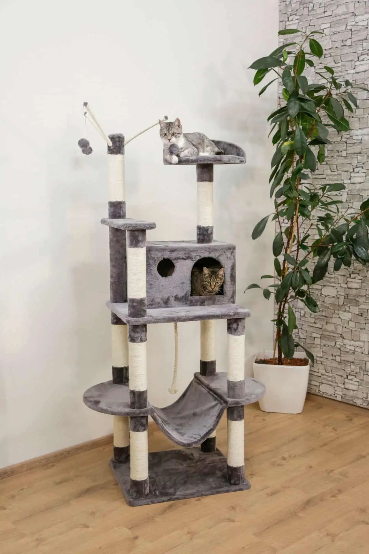 Scratch Tree Matteo Grau erbjuder en viktig funktion som en lekplats och viloplats för din katt. Han ser till att din katt har sitt eget område för att tillfredsställa sina naturliga instinkter genom att skrapa, spela, vila och observera omgivningen.