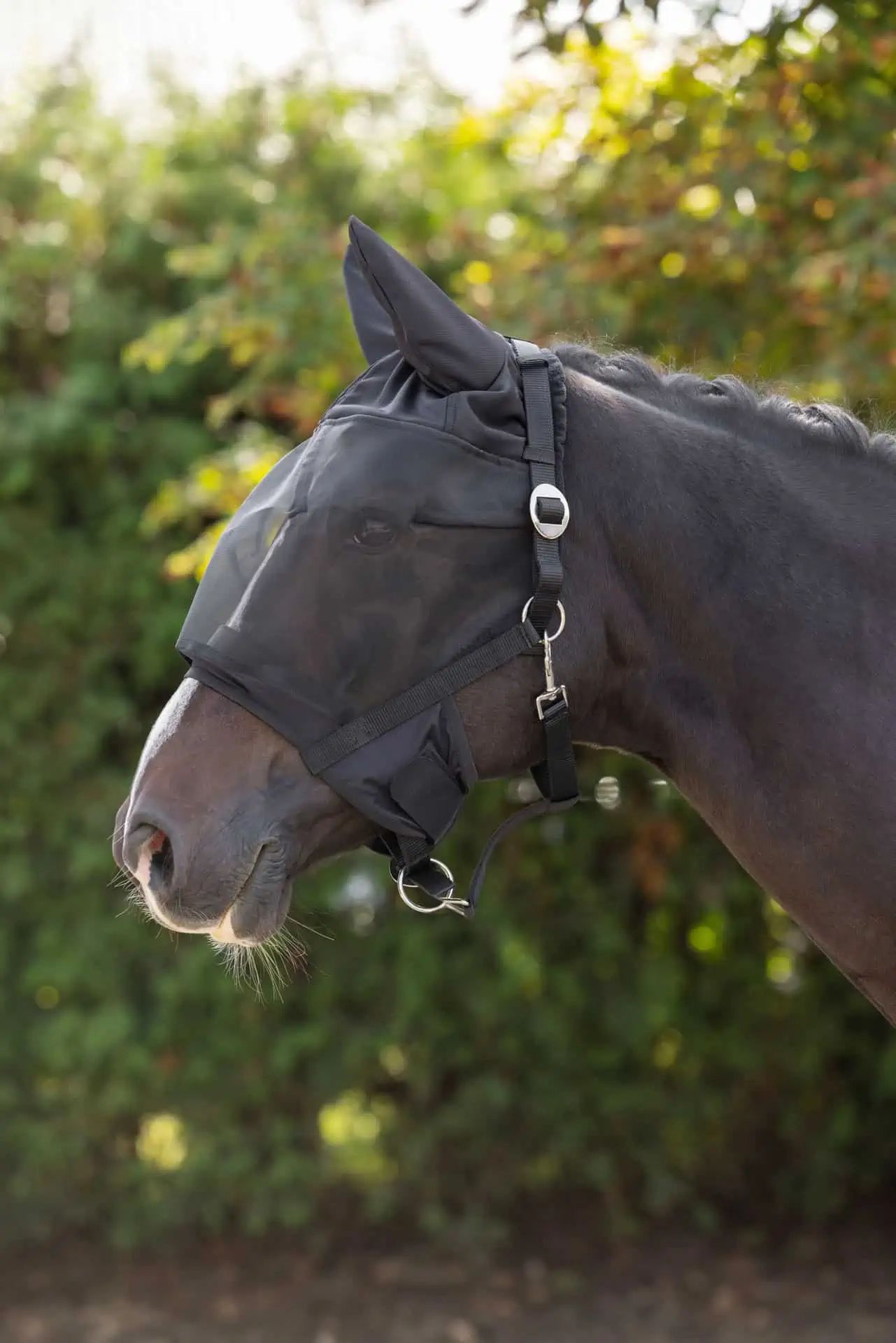 - Flexibelt Lycra-material och kardborreknäppning i nosområdet för optimal anpassning till hästens huvud
