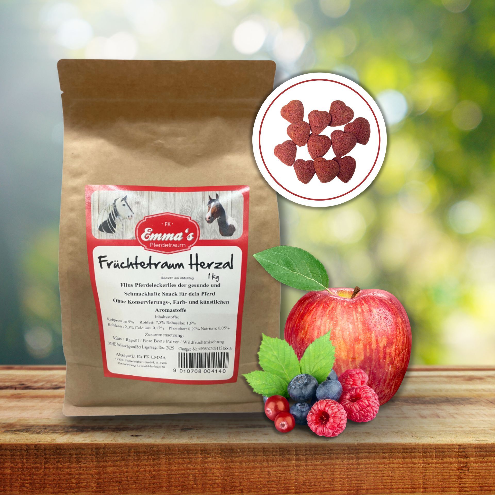 Emma's Horse Treats Fruit Dream Hearts are the perfect reward for your horse. These treats serve the purpose of giving your four-legged friend a healthy and tasty joy. 100% natural, without any artificial colors & preservatives and no flavor enhancers, thus 100% chemical-free. Made in Germany in a small mill, these treats are characterized by their very intense flavor and the extremely high acceptance among horses.