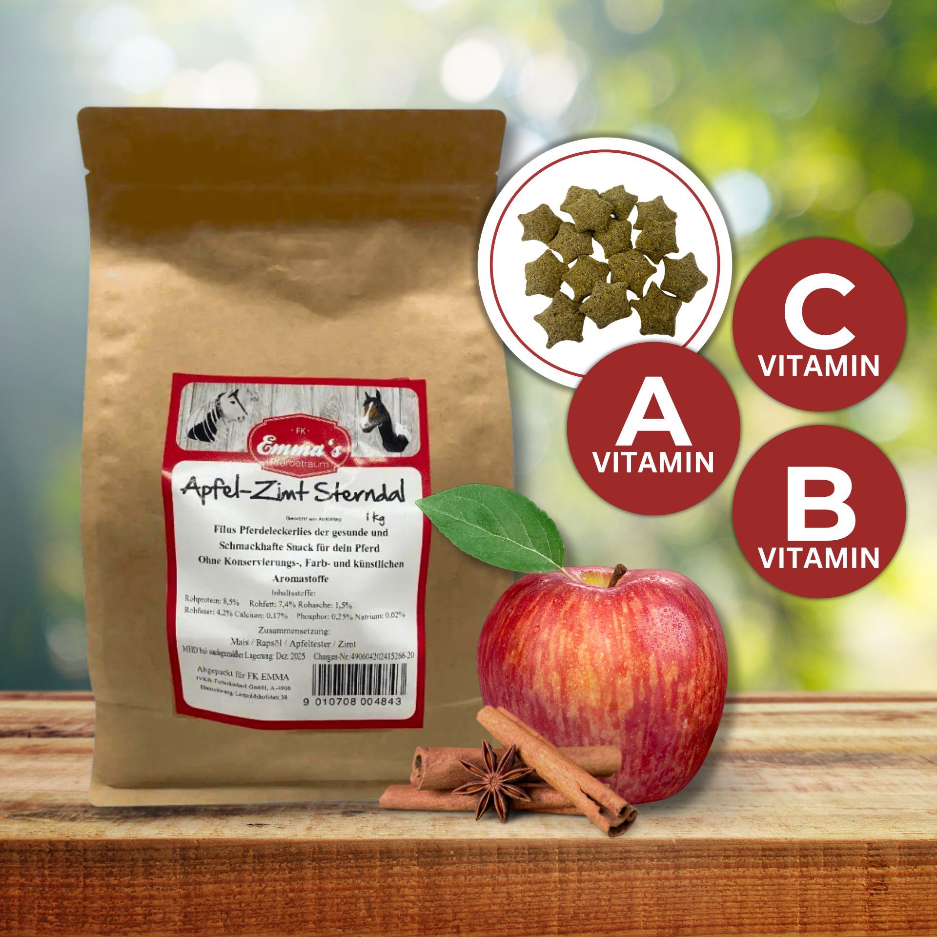 Emma's Horse Treats Apple Cinnamon Stars are the perfect treat for your horse! These delicious treats not only offer an irresistible taste but are also healthy and natural. 100% natural means they are made without any artificial colors & preservatives – no flavor enhancers and therefore 100% free of chemicals. Made in a small mill in Germany, these treats are very flavorful and enjoy extremely high acceptance by horses.