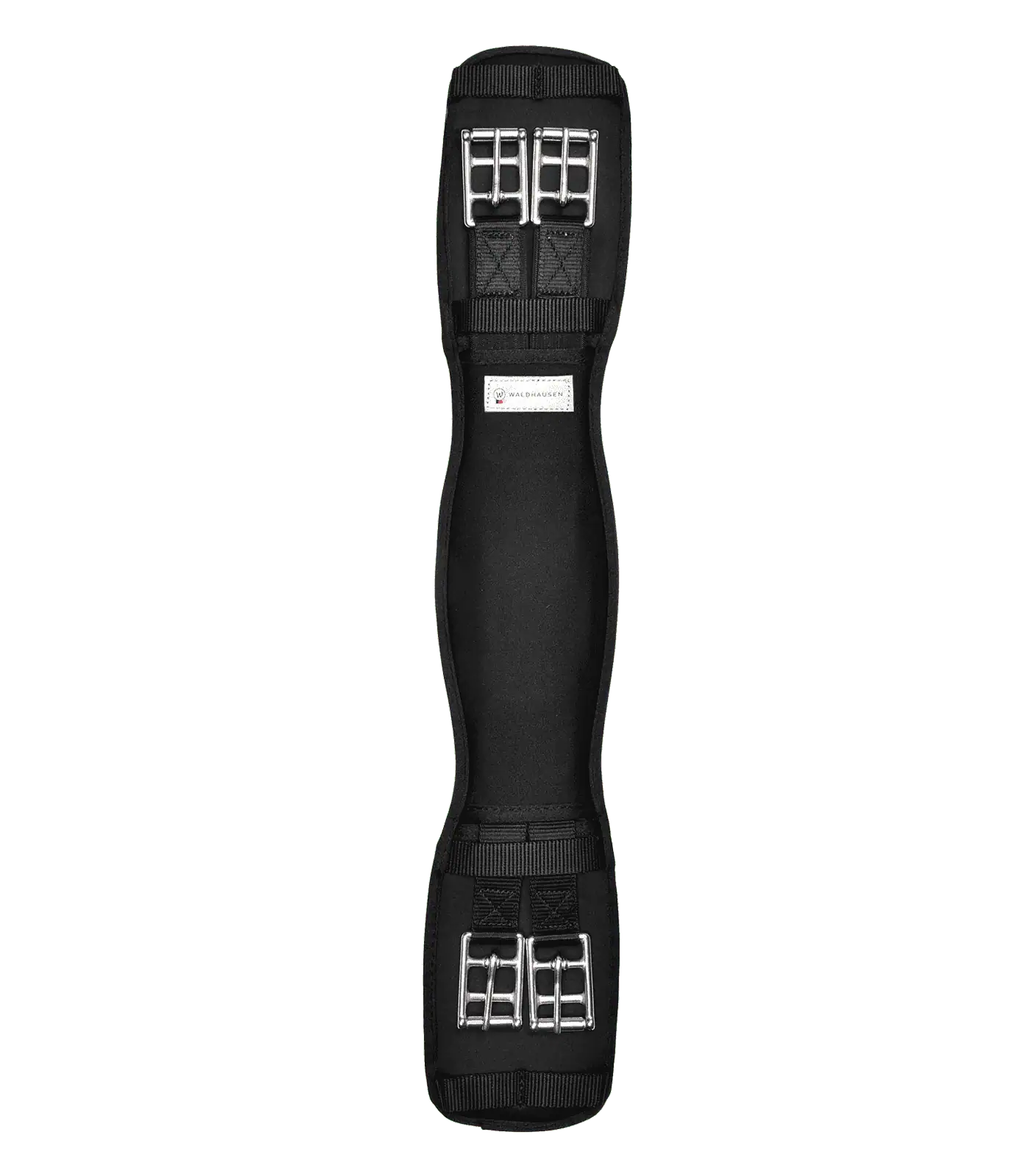 The high quality material with with integrated gel filling protects the girth area and reliably holds the saddle in the correct position. With stainless steel roller buckles and elastic at the end on one side.