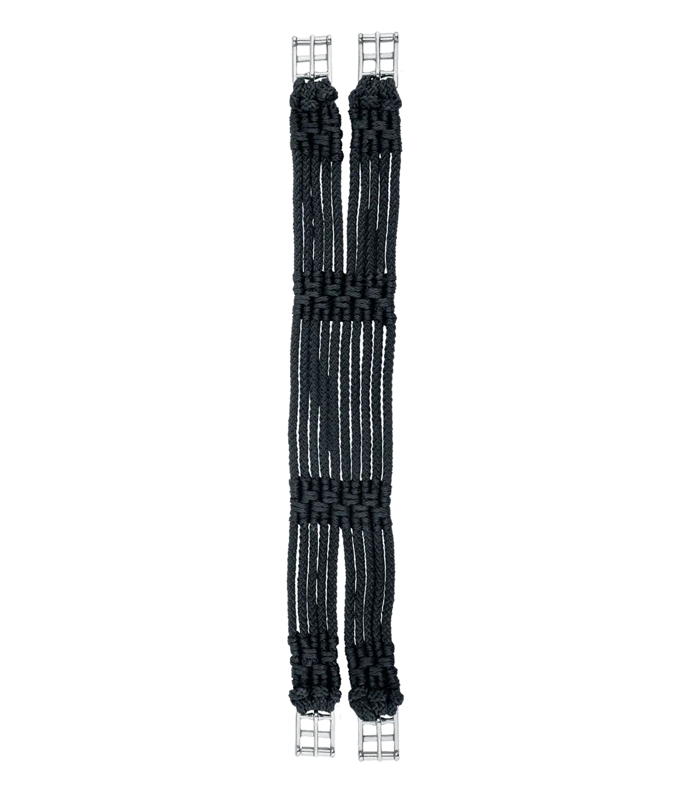 String girth in soft synthetic fibre material with stainless steel buckles. With loops for girth straps. As a short girth, the use of the buckle guard, article 19084, is recommended in order to prevent rubbing.