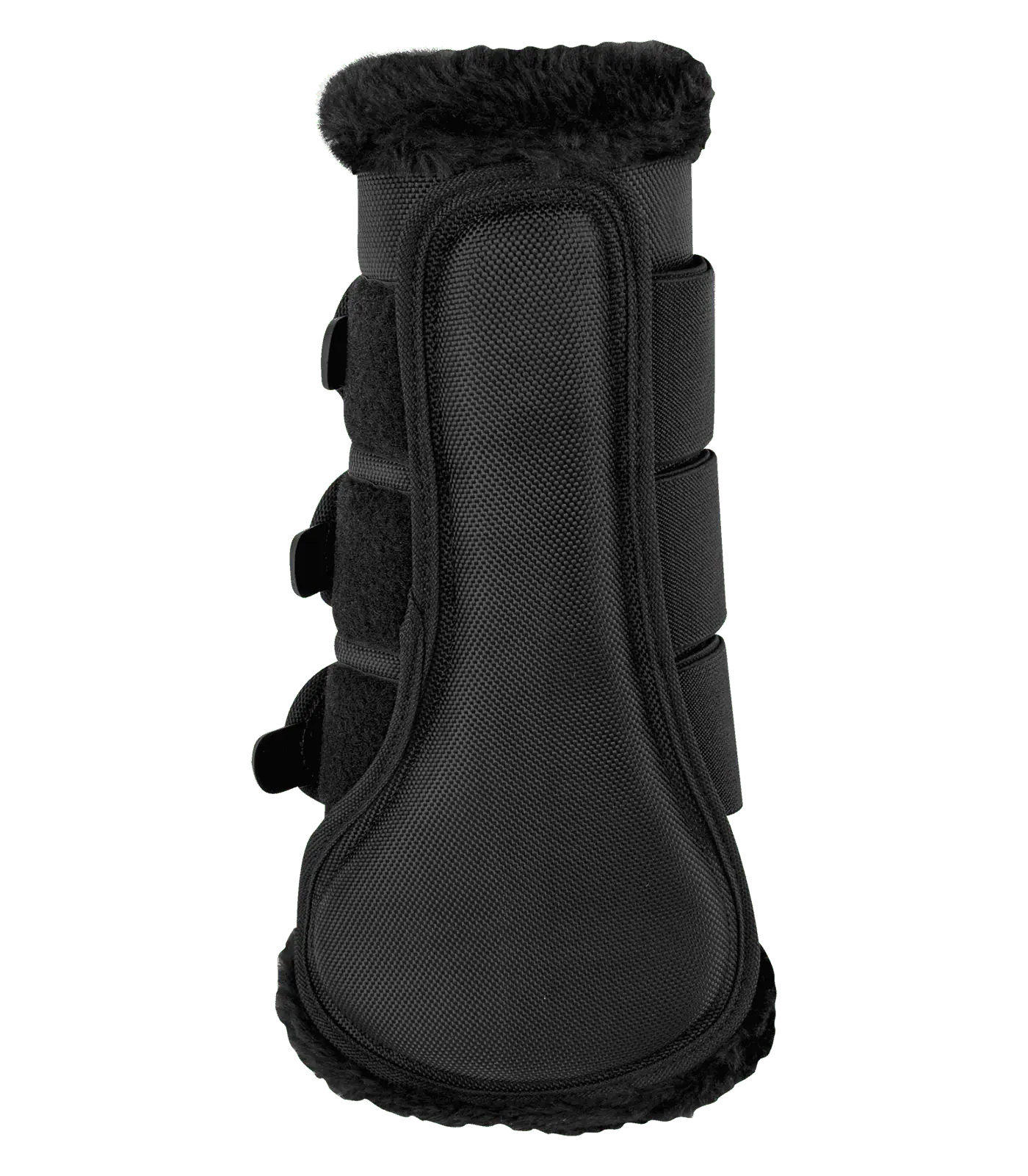 Dressage boots for fore- and hind legs. The outer material is in a robust 1680 denier material and provides good impact protection. The soft synthetic fur edging ensures a pleasant wearer comfort. The inner material consists of a breathable mesh in order to prevent heat from building up. With a small silver-coloured metal logo. Pair.