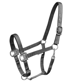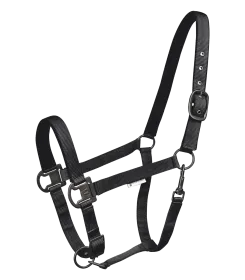 Softly underlaid halter, adjustable to several positions. With matt, dark fittings. Adjustable to several positions at the chin strap and headpiece (one side). Matches the Gloomy lead rope 50486 and 50487.
