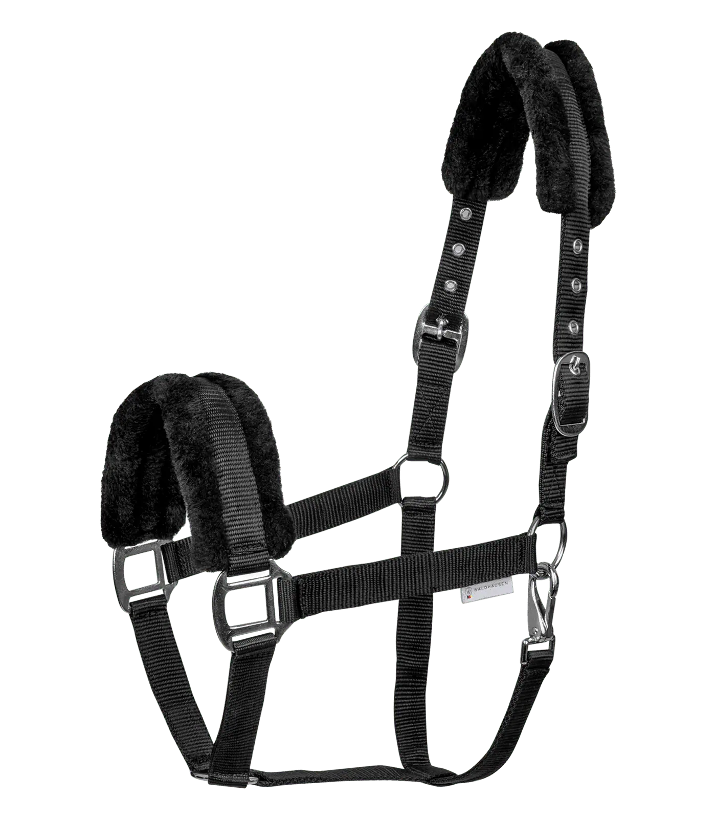 Fluffy halter with soft padding in synthetic fur on headpiece and noseband. Adjustable on both sides at headpiece.