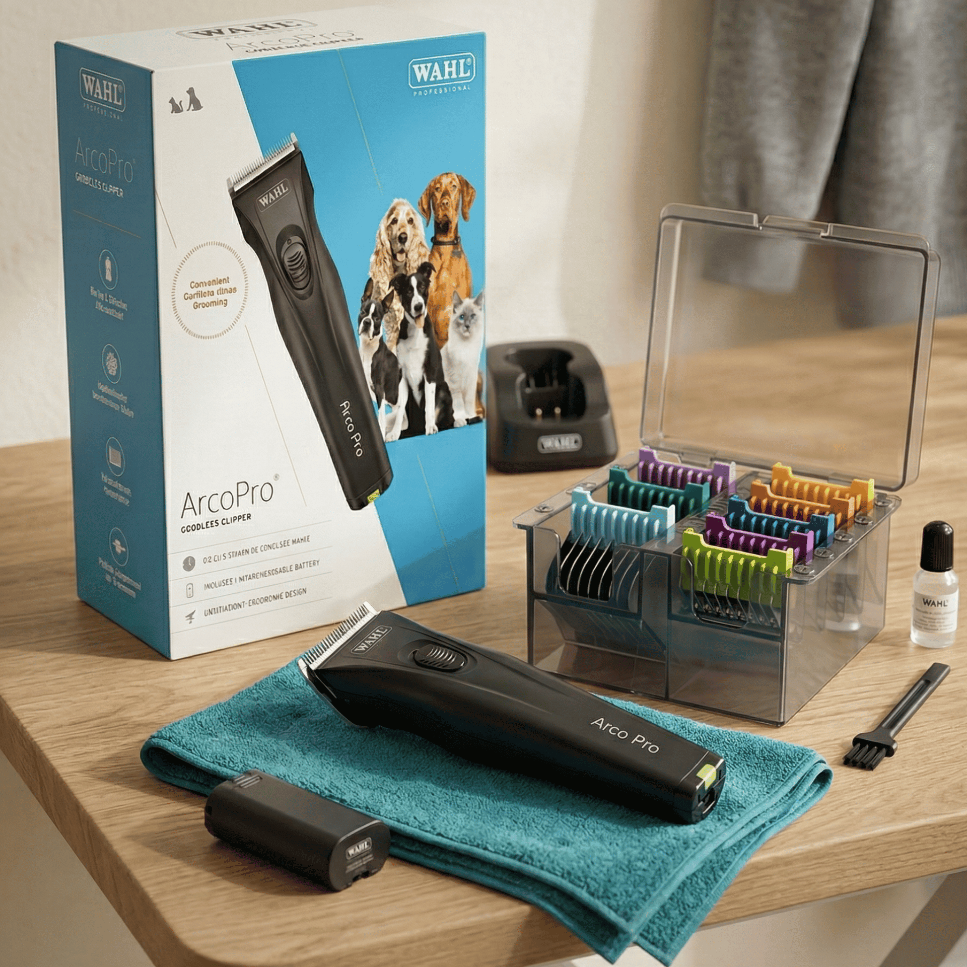 Wahl Arco Pro Dog Clipper 1x battery: The Perfect Grooming for Your Pet The Wahl Arco Pro Dog Clipper is your reliable partner for the full grooming of medium-sized dogs and cats as well as all detailing work. This powerful and ergonomic pet hair trimmer offers you maximum flexibility with its interchangeable battery, providing an impressive runtime of 120 minutes. Thanks to the automatic speed control, you can always expect consistent cutting performance regardless of coat condition. The easily removable professional blade set with fine teeth and integrated cutting length adjustment (0.7 - 3 mm) leaves nothing to be desired and is perfect for those who value precision and comfort. Whether you are a passionate pet owner or a professional breeder, the Wahl Arco Pro is perfect for you. With its lightweight design of only 280 g and quiet operation, it ensures a pleasant grooming experience - for both you and your pet. The powerful lithium-ion battery not only guarantees a long runtime but also a quick recharge in just 75 minutes, so you can be ready again in no time. The LED battery status indicator always provides information about the battery level and allows for timely replacement. Overview: Flexible pet hair trimmer with interchangeable battery Full grooming for medium-sized dogs and cats Ergonomic, quiet, automatic speed control Lithium-ion interchangeable battery, 120 min runtime 0.7 - 3 mm cutting length adjustment Ideal for pet owners and breeders Technical Data: Type: Cordless pet hair trimmer Blade set: Professional interchangeable blade set Cutting width: Cutting length 0.7/1.4/1.8/2.5/3 mm Drive: DC motor approx. 5,300 rpm Operating voltage: 100 - 240 V Runtime: 120 min Charging time: 75 min Dimensions: approx. 170 x 50 x 50 mm Weight: approx. 280 g Battery type: Li-Ion Included: 1x Wahl Arco Pro Dog Clipper 1x Battery 1x 5in1 blade set 1x Li-Ion interchangeable battery 1x Charging stand 1x Charging cable 1x 4 attachment combs (3,6,9,12 mm) 1x Oil 1x Cleaning brush Questions & Answers: Is the clipper suitable for all coat types? Yes, it is suitable for both long-haired and matted fur. An optional coarse-tooth blade is available for short hair. How long does the battery last and how quickly is it recharged? The battery lasts up to 120 minutes and is fully recharged in just 75 minutes. Can the machine also be used for small dogs? Yes, it is also suitable for smaller dogs, especially for detail work.
