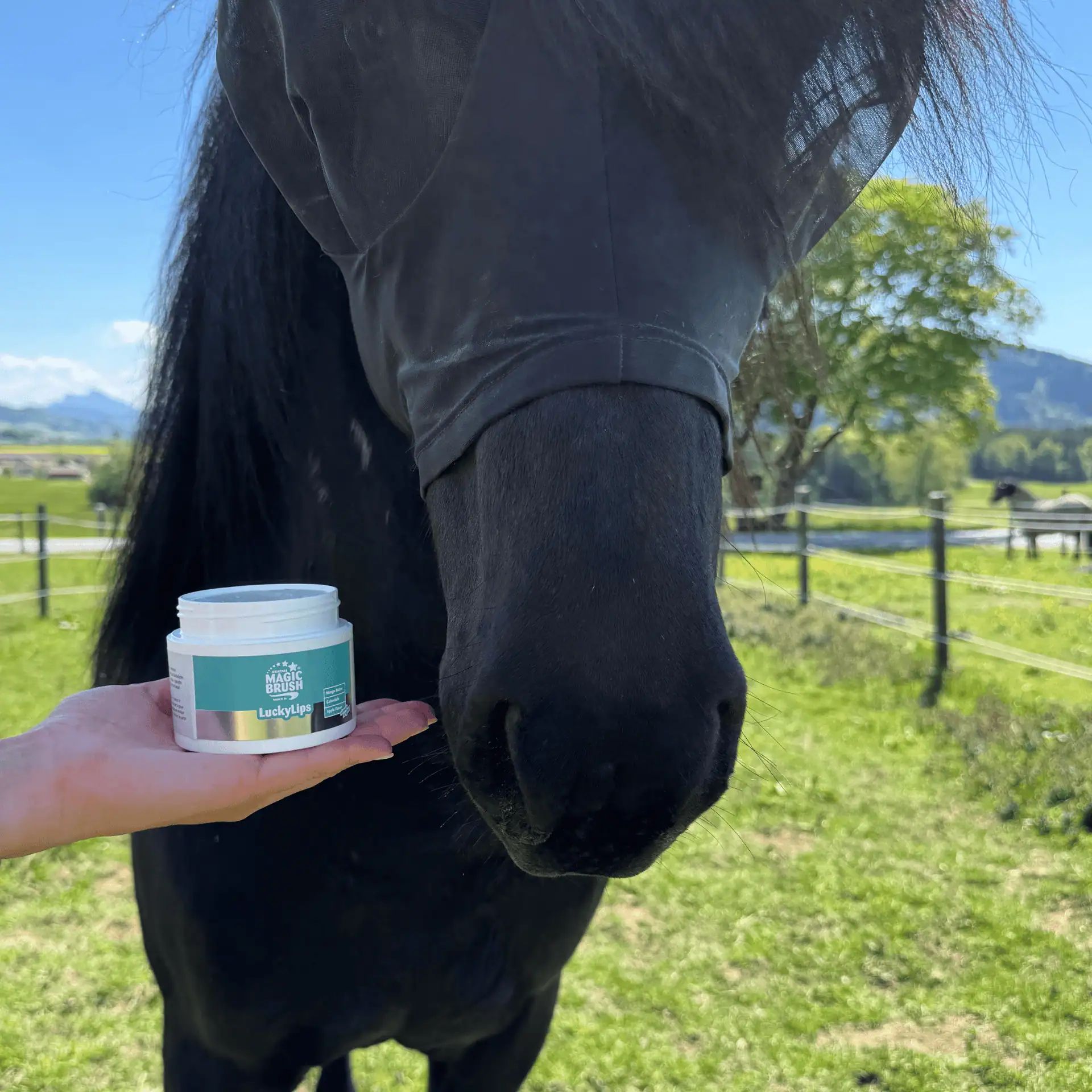 Lucky Lips lip balm contains nourishing ingredients such as calendula, mango butter, and petroleum jelly to keep the skin supple and moisturize. It is particularly helpful for horses that are sensitive to bits and promotes the animal's well-being while riding.