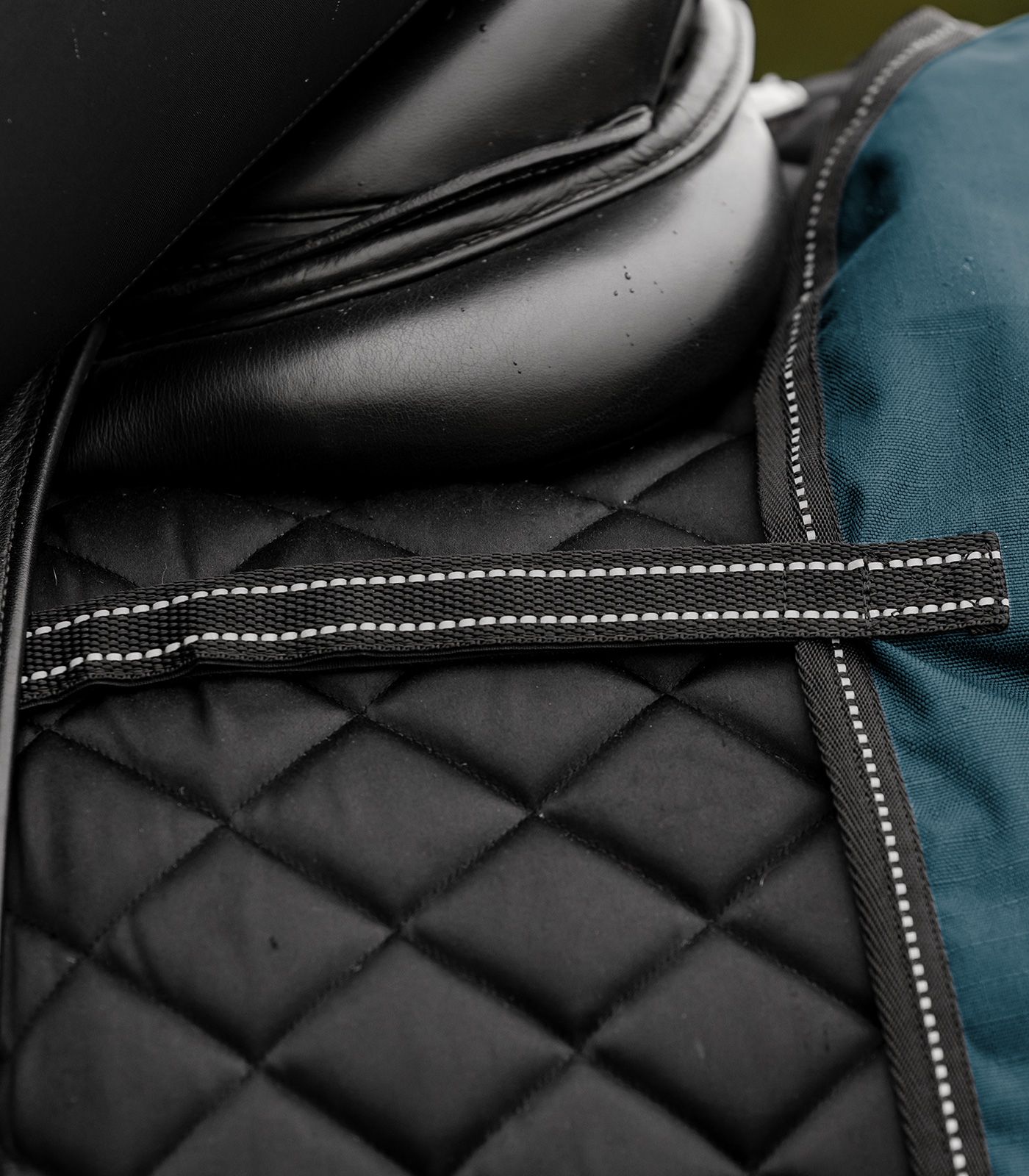 The kidney blanket is easily and securely attached to the saddle with long Velcro fasteners.