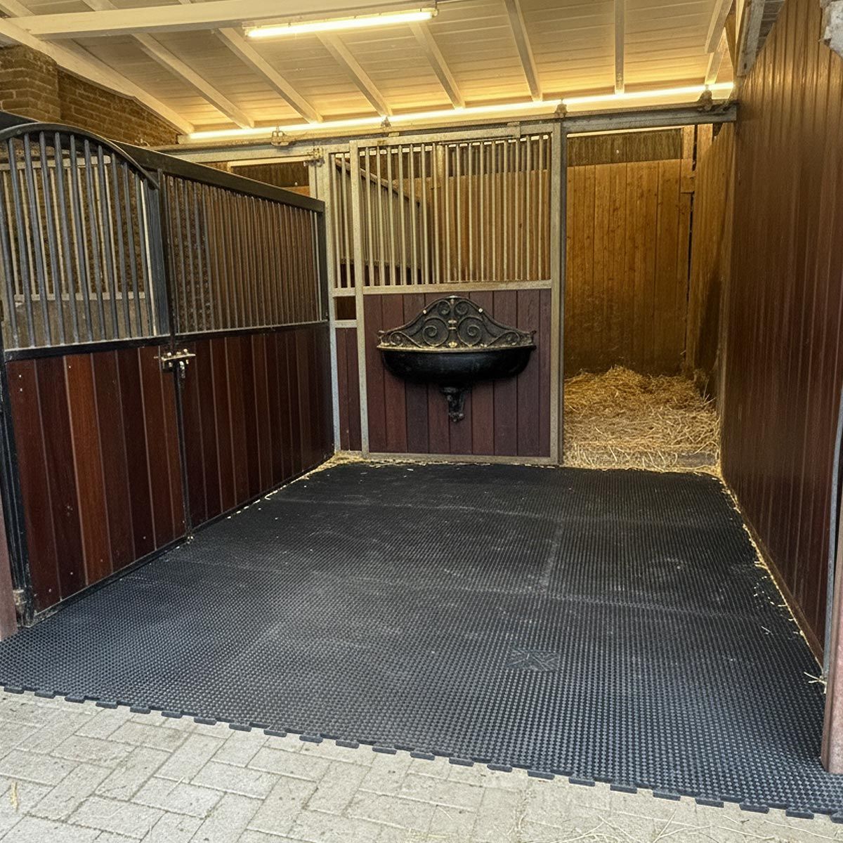 De övre knottrarna ger säkert steg, medan de nedre kanalerna säkerställer optimal avledning av fukt och därmed torra och rena boxar. Den 4-sidigt pusselliknande konstruktionen möjliggör enkel och flexibel läggning, helt efter dina behov.