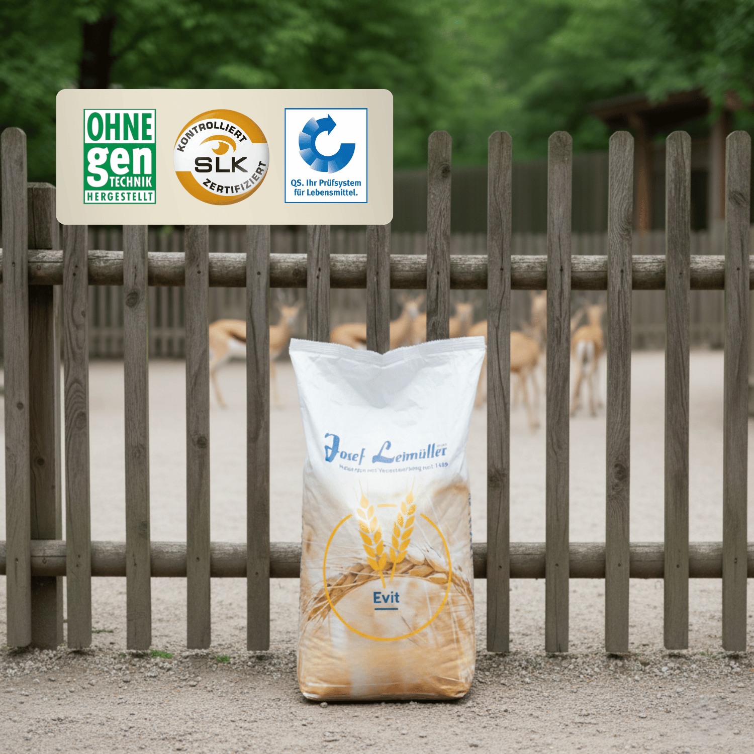 Leimüller Djurfoder 25 kg är ett högkvalitativt fodertillskott, speciellt utvecklat för en balanserad och behovsanpassad utfodring av zebra, muntjaks, tapirer, rådjur, älgar, antiloper, girafferoch andra zoologiska djur. Receptet baseras på flera gånger renade, högkvalitativa råvaror och är helt fritt från genmodifierade ingredienser. Med sin balanserade sammansättning tillför fodret alla viktiga vitaminer och spårämnen som är viktiga för djurens hälsa, vitalitet och utveckling. Pelletsens storlek på 4,5 mm passar perfekt för många stora och medelstora zoologiska djur.