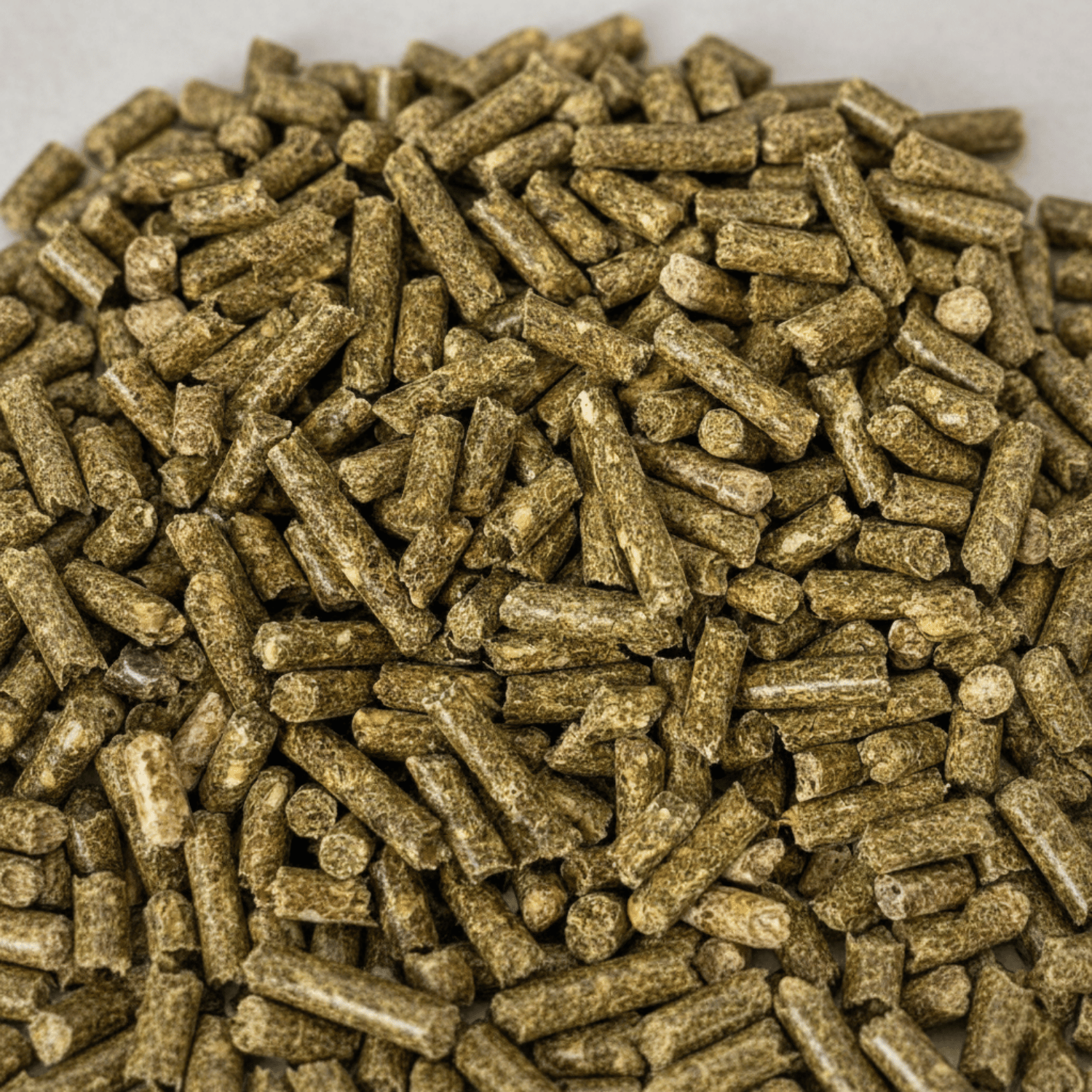 Äppelrester, rapskaksfoder med stjälkar, vetekli, sockerbetsmassa, lusern, majs, lignocellulosa, kalciumkarbonat, natriumklorid, monokalciumfosfat, solrosolja, magnesiumoxid, triticale, öljäst, bananarom