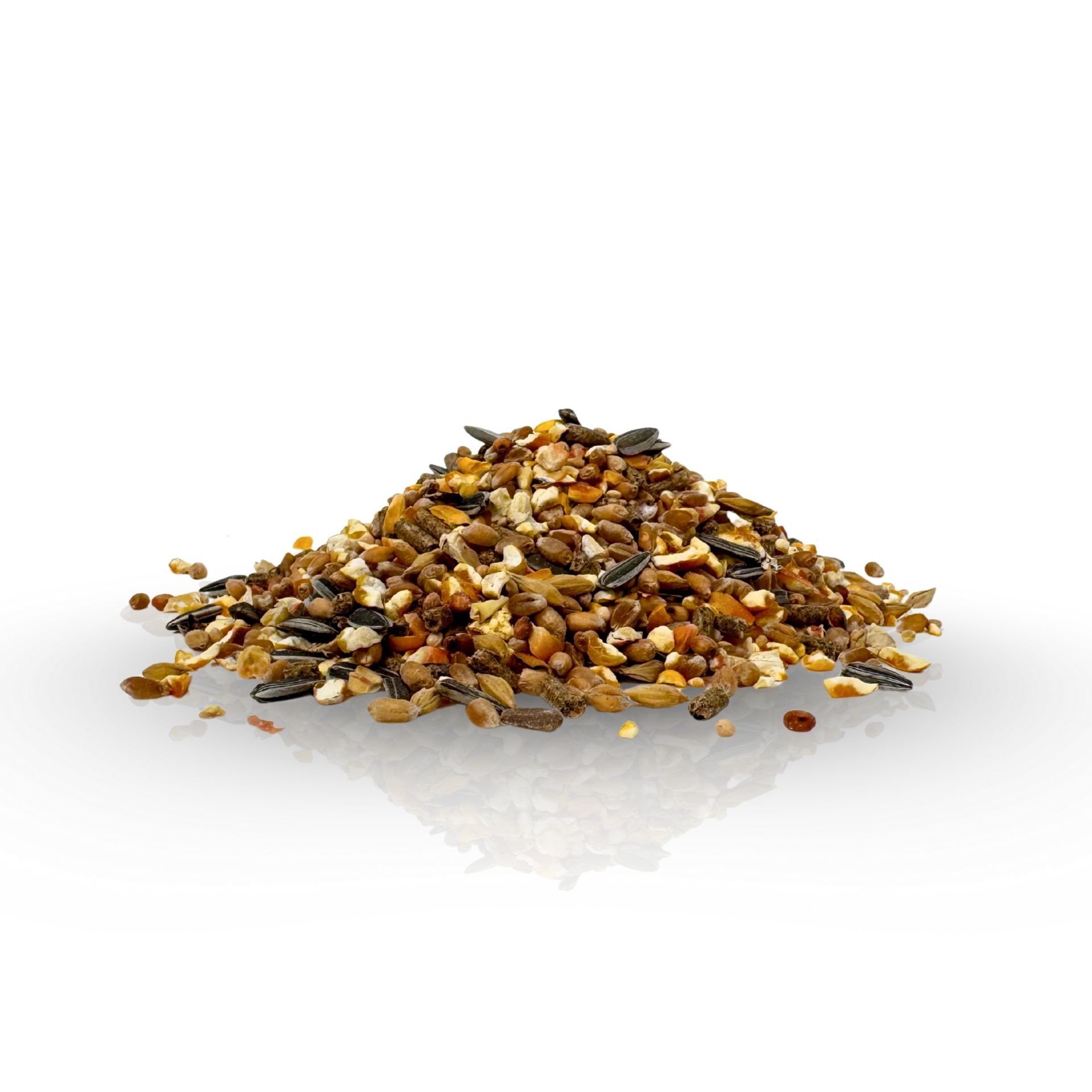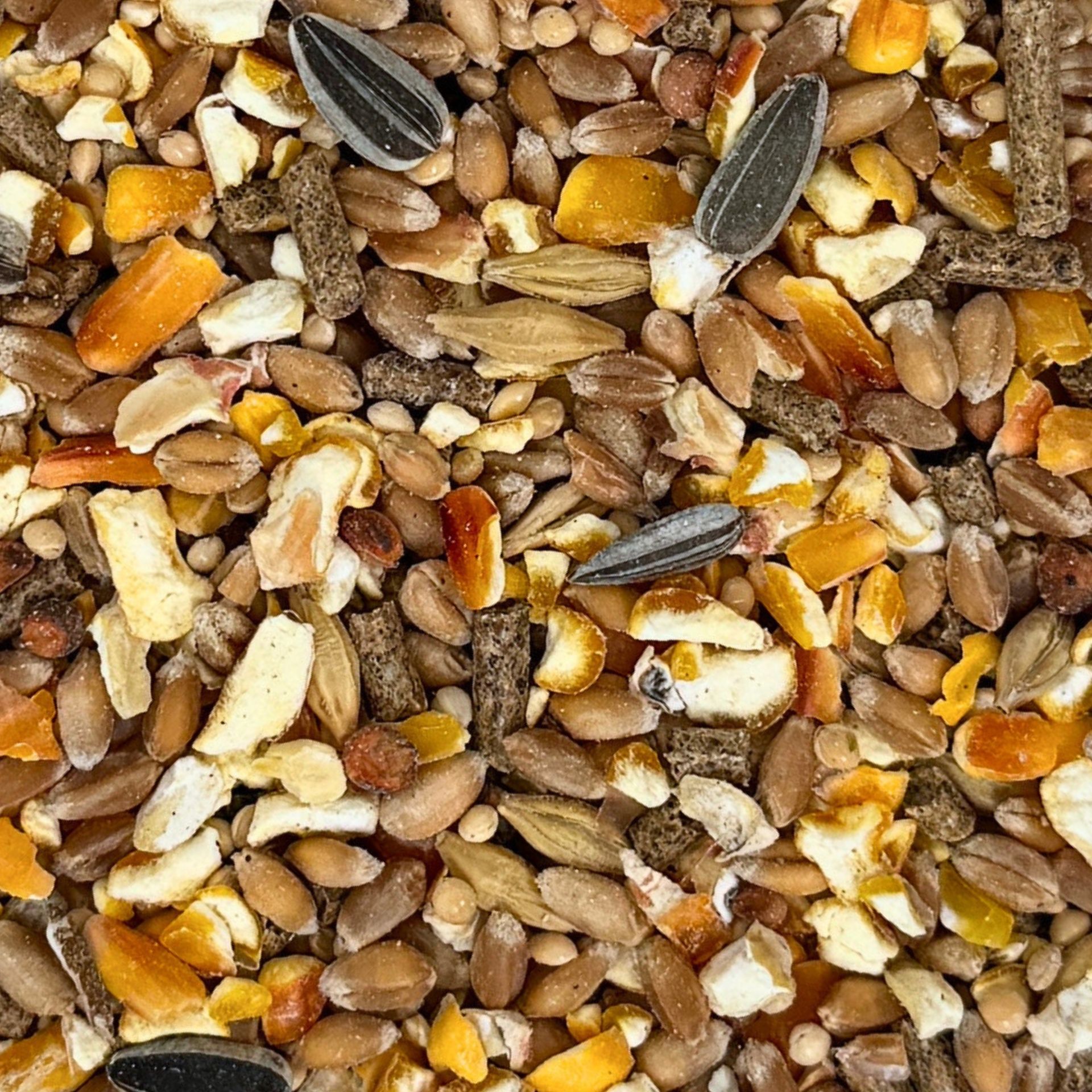 35% krossad majs, 8% bryggeri korn, 38% vete, 4% gul hirs, 2% strimlade solrosfrön, 3% mjölkmajs, 10% ANTI-STRESS-pellets