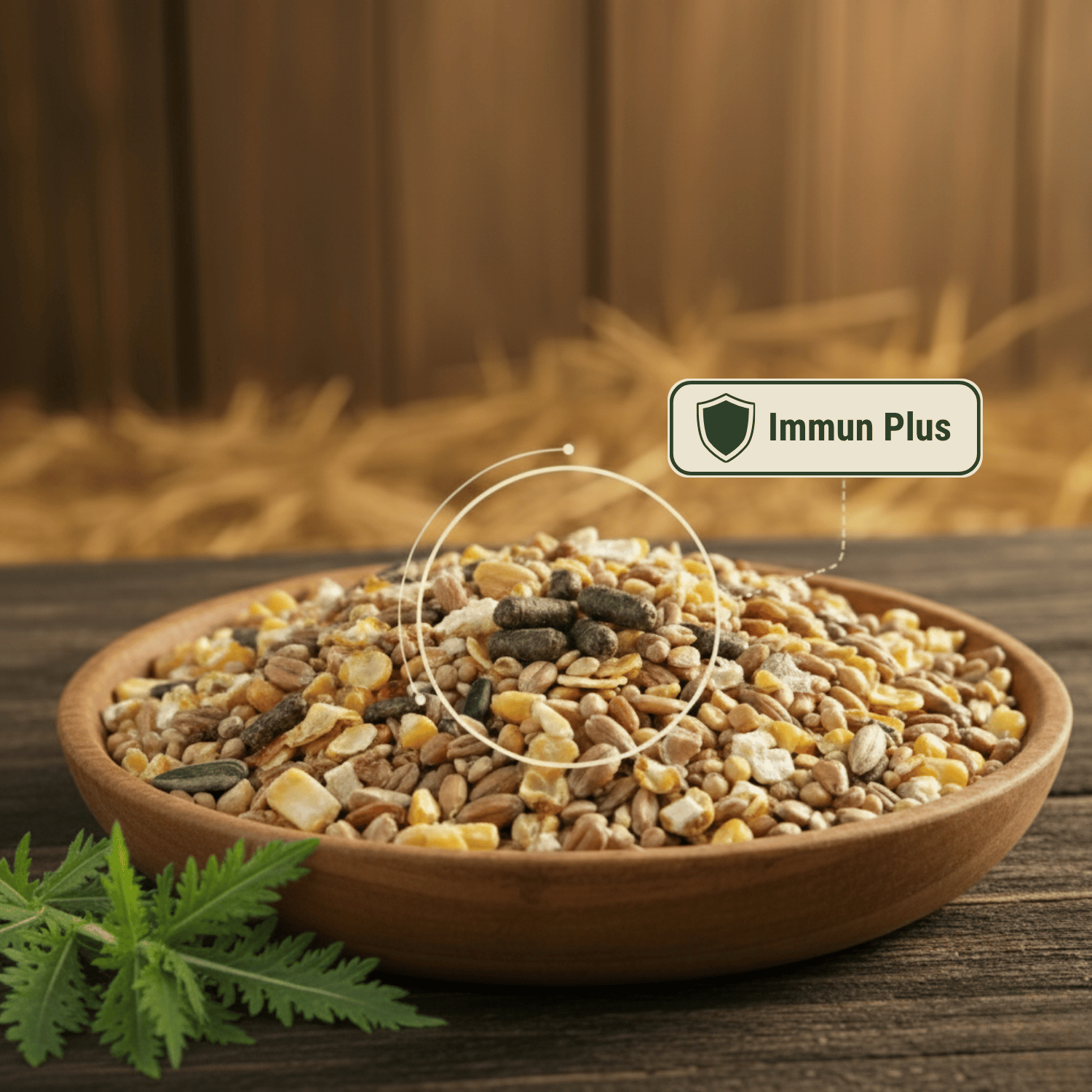 Are you looking for a feed solution that not only satisfies your hens but actively protects them? Then our Leimüller Premium Chicken Feed with the innovative Immune Plus Pellets is the ideal choice! This balanced vitality muesli has been specially developed to optimally support the health, immune defenses, and laying performance of your animals.