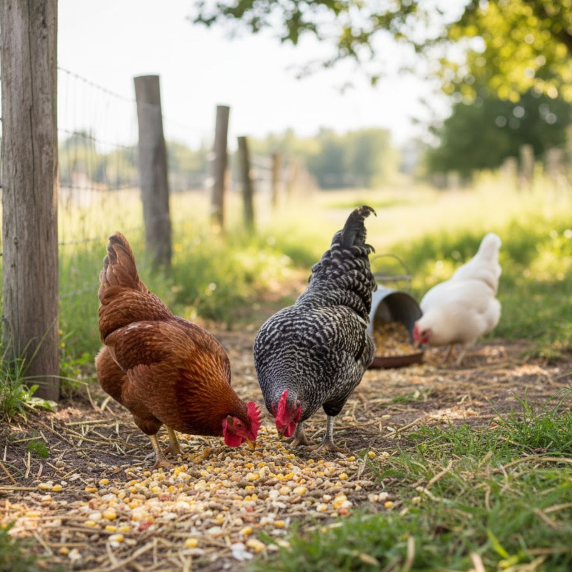 Hönsfoder består bland annat av värphönsgranulat, sojaskrov, persilja, solrosolja, purjolök, rödbetor, morötter, musslesand med oregano, vete och majs.
