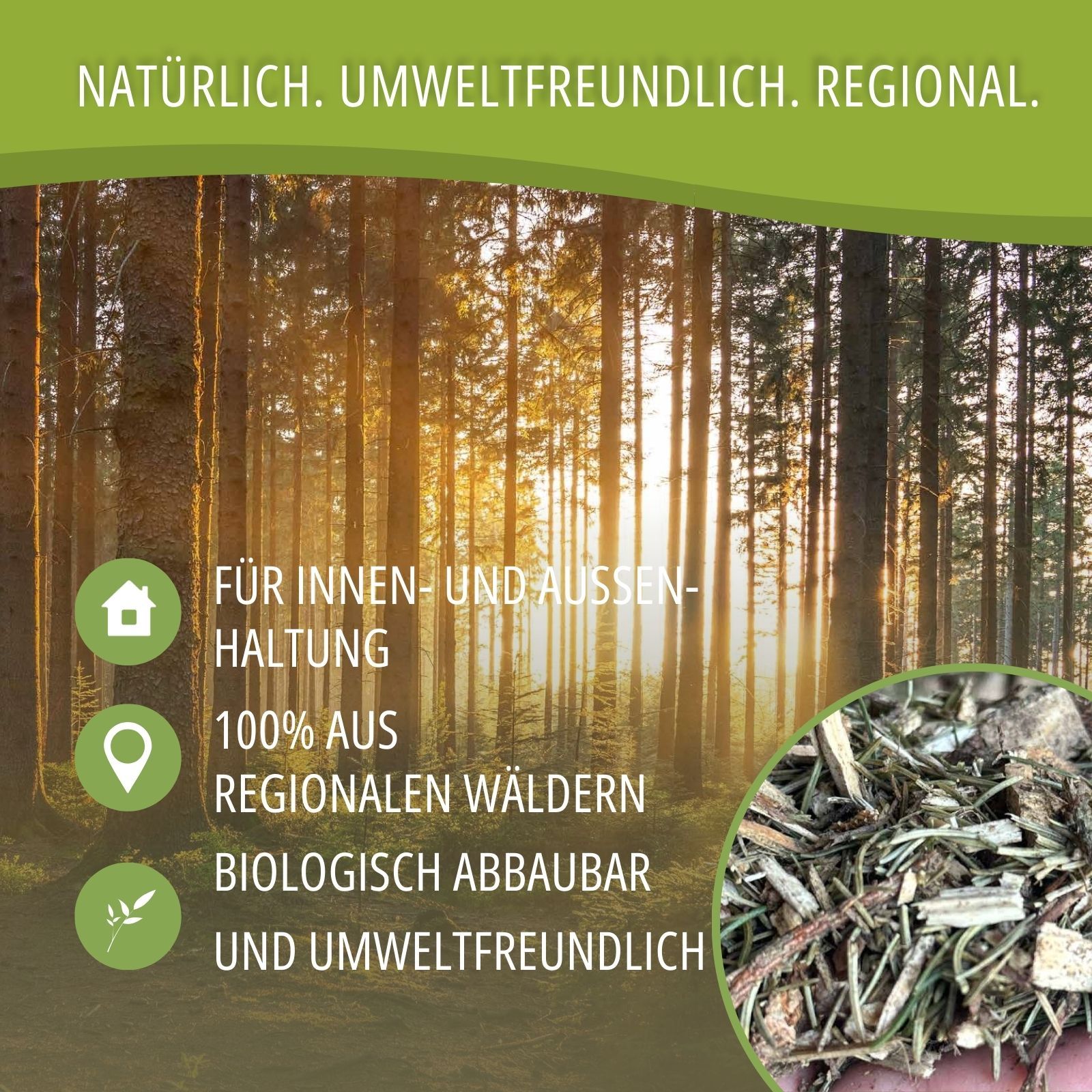 For the system to work optimally, a layer of at least 10 cm height is recommended when first applying. Since the surface settles ("sinks") by about 5 cm in the first one to two weeks, regular topping up keeps the ideal height and guarantees the maximum functionality of the forest floor bedding. You can also rely on offering your animals a safe environment, because the product is 100% natural & biodegradable. It is free from any chemicals and can be composted easily after use. So you combine sustainable coop hygiene with exciting entertainment and do something good for your feathered friends every day.