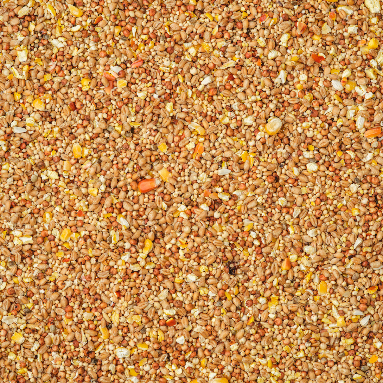 34,0 % vete, 23,0 % gul hirs, 21,0 % milokorn, 17,0 % grovmalet majs, 2,0 % dari, 1,0 % havregryn, 1,0 % hjärtfrö, 1,0 % hampa